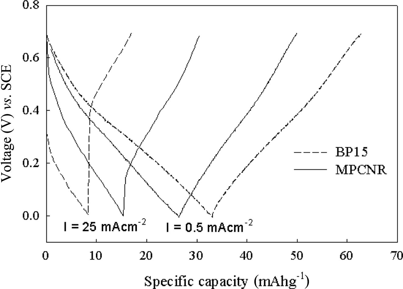 Figure 6 Galvanostatic charge-discharge patterns for MPCNR and BP15 electrodes measured at 0.5 and 25 mA cm-2 between voltage range from 0 to 0.7 V vs SCE. |
