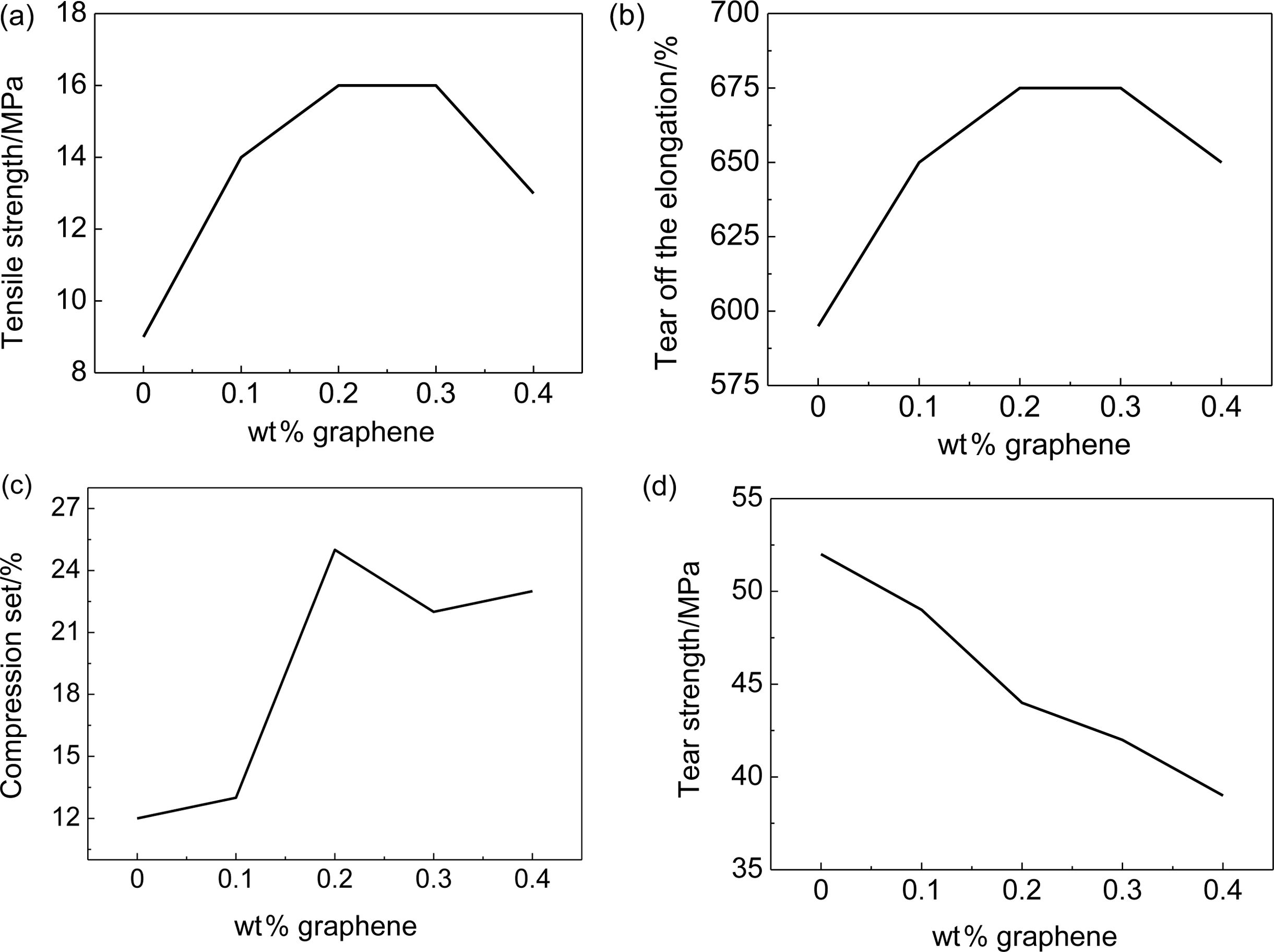 Figure 2 Physical and mechanical properties of composites with different graphene contents: (a) tensile strength; (b) tear off the elongation; (c) compression set; (d) tear strength. |