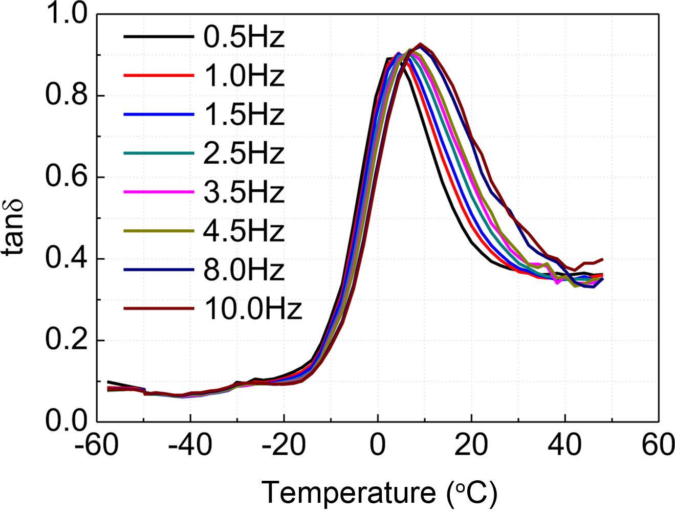 The dynamic performances were obtained by dynamic mechanical analyzer (PerkinElmer, USA, DMA 8000). The tests were carried at the frequency of 3.5 Hz with the temperature ranging from -50 °C to +60 °C, as well as the heating rate being 3 °C/min. According to seismic behavior of dampers or isolators, the shear mode was used. Referring to GB/T 9870.1-2006 “Rubber, vulcanized or thermoplastic—Determination of dynamic properties—Part 1: General guidance”, the dimension of the specimens was 50 mm×8 mm×2 mm.