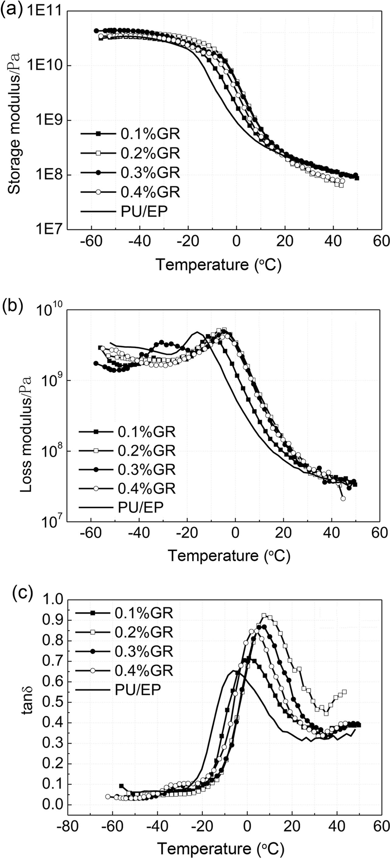 Figure 4 Dynamic mechanical properties under different graphene contents: (a) storage modulus; (b) loss modulus; (c) tanδ |