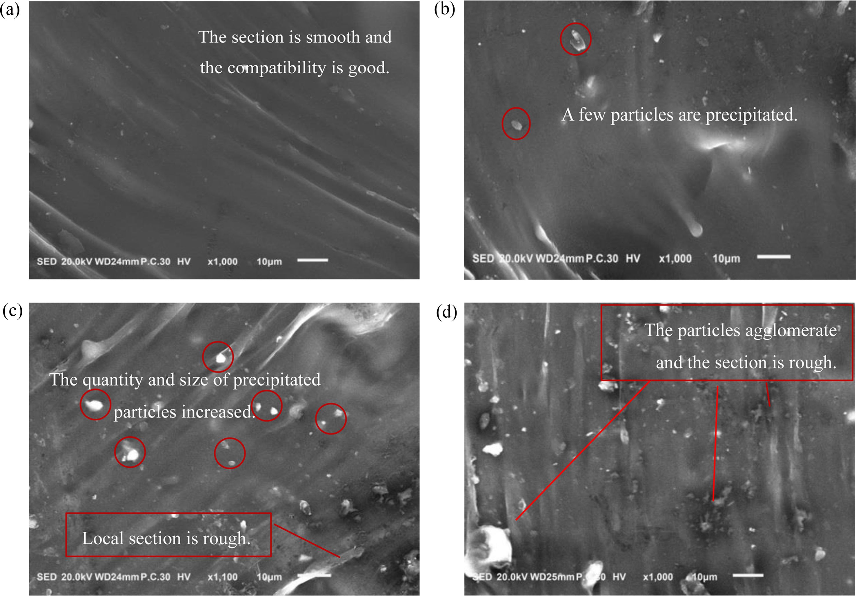 (4) It was shown by SEM analysis that with the increase of graphene contents, agglomeration intensified. With the increase of graphene contents, more and more particles were precipitated from the cross section of the composites, and the cross sections were getting rougher and rougher.