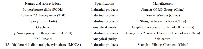 Specimen Preparation. γ-Aminopropyl triethoxysilane (KH-550) was used to modify graphene for preventing agglomeration and improving its compatibility with PU. Firstly, 90 wt% ethanol was prepared by mixing 80 g ethanol with 20 g KH-550 and stirred for 10 min at 250 r min-1. Then, 1 g graphene was added into this solution. After ultrasonic dispersing for 1 h, it was stirred for 2 h and was filtered with ethanol for three times. Finally, the filter material was placed in an oven at 80 °C for 12 h, taken out and sealed.