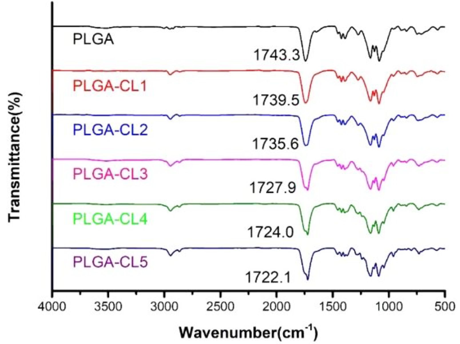 Figure 6 FTIR spectra of PLGA-CL with different content of CL. |