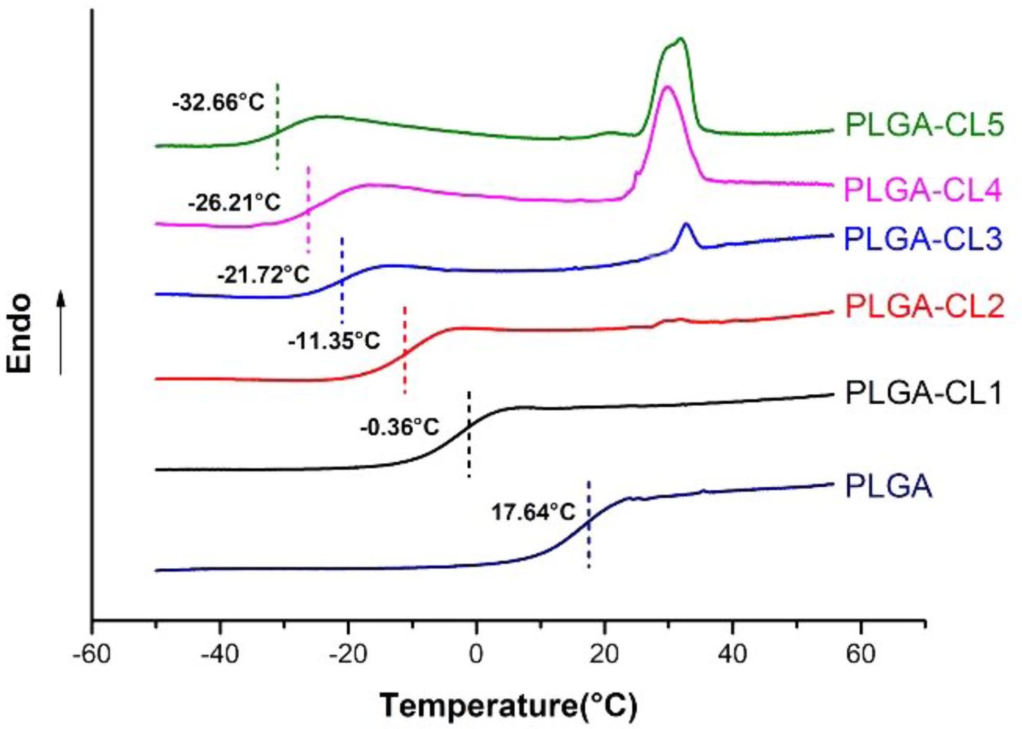Figure 7 DSC graph of PLGA-CL with different content of CL. |
