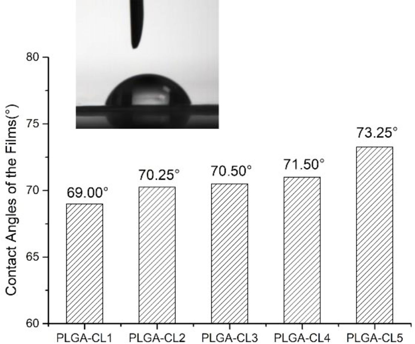 WCA results are shown in Figure 8 by testing the contact angles of polymers with different content of CL, it is obvious that the WCA of the polymers is below 90 °C, indicating that the polymers are hydrophilic. This phenomenon is resulted from the polymerization with CA as the starting agent, and a large number of carboxyl groups at the end of the polymer make the polymer hydrophilic properties. Another noteworthy phenomenon is that with the increase of the content of CL, the WCA of polymer films with different content of CL increased from 69.00 to 73.25°. This is because PCL is a hydrophobic material. The introduction of CL into the ring-opening polymerization resulted in a slight decrease in the hydrophilicity of the polymer.