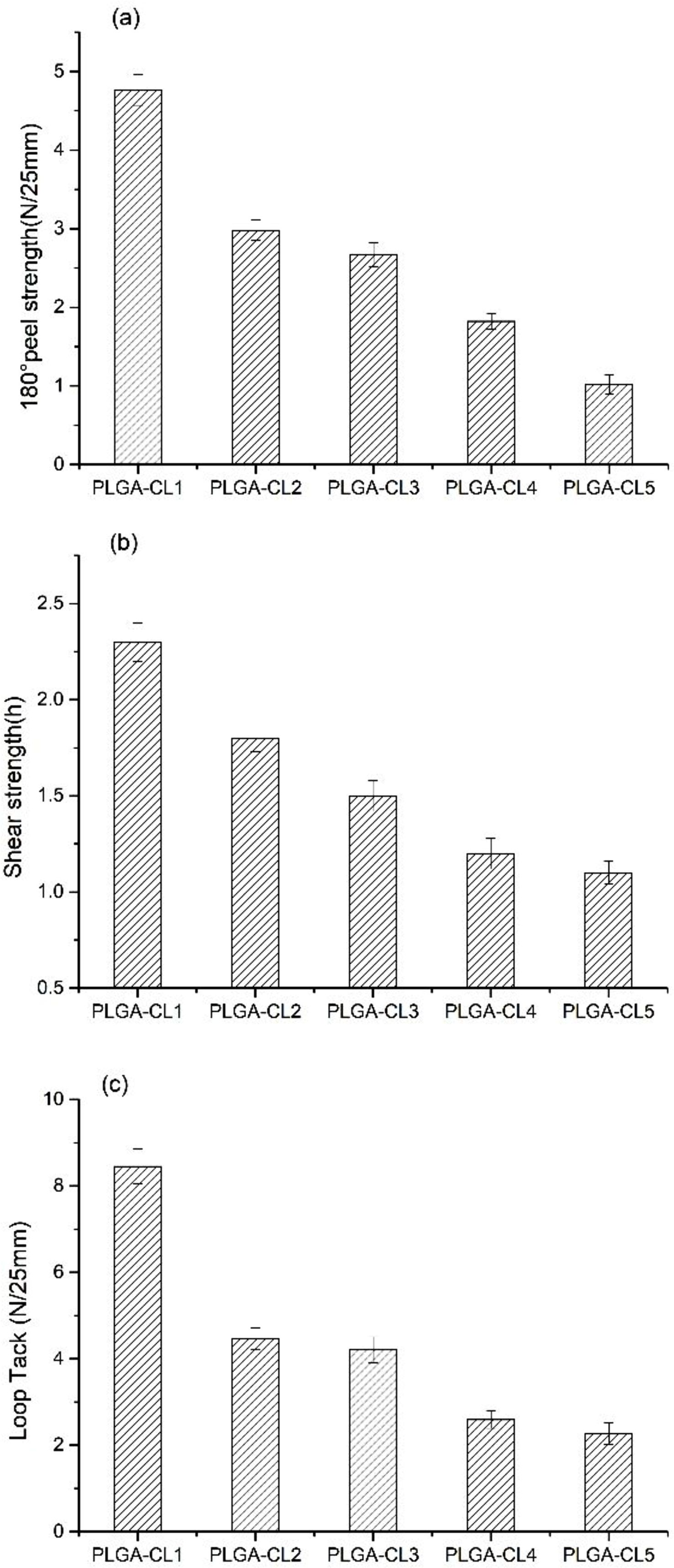 Adhesive Properties Analyses. The experimental results of 180° peel strength, shear strength, and loop tack are shown in Figure 9. For PSA properties, the adhesion and cohesion required by PSA are very important.26 Since PLGA prepared by us is non-viscous at room temperature, PLGA is not pressure-sensitive viscous when the addition of CL is 0. As can be seen in the figure, the copolymers are pressure-sensitive viscous with the addition of CL. This phenomenon is due to the addition of CL into the system makes the polymer's molecular chain flexible and long, while the molecular weight and intermolecular force increase, the Tg of the copolymer decreases. On the other hand, when the CL content is the lowest, the copolymer 180° peel strength, loop tack, and shear strength are the highest. This is, because with the increase of CL content, the degree of polymerization of PCL segment increases, and the copolymer shows crystallinity, which may lead to the decrease of polymer viscosity. Interestingly, it can be concluded from Figure 9(a) that the peel strength of PSA decreases with the increase of CL content. This is because PCL is a semi-crystalline polymer that is not viscous. When the CL content increases, the degree of polymerization of some PCL chain segment gradually exceeds 5 and shows crystallinity, which leads to the decrease of the peel strength. On the other hand, the wettability of materials also affects the adhesive of PSA. With the increase of CL content, the hydrophilicity of the polymer decreases, which leads to the peel strength decreases. As can be seen from Figure 9(b), as expected, the shear strength of PSA gradually decreases with the increase of CL content. This is because, with the increase of CL, the molecular flexible chain segment becomes longer, the cohesion strength of PSA decreases, and the failure type changes into cohesion failure, which leads to the decrease of shear strength. As shown in Figure 9(c), the loop tack is very similar to the peel strength with the change of CL content. Therefore, the above hypothesis explains the peel strength should also be applicable to the change of loop tack. When CL content was 16.7 wt%, 180° peel strength was 4.76 N/25 mm and loop tack was 8.45 N/25 mm. The experimental results showed that loop tack was similar to that of the self-crosslinking fluorinated polyacrylate pressure-sensitive adhesive prepared by Fang,24 and the peel strength was about half of that of the self-crosslinking fluorinated polyacrylate pressure-sensitive adhesive. We found that by controlling the content of CL to control 180° peel strength and shear strength of the copolymer, so as to obtain the appropriate mechanical properties.