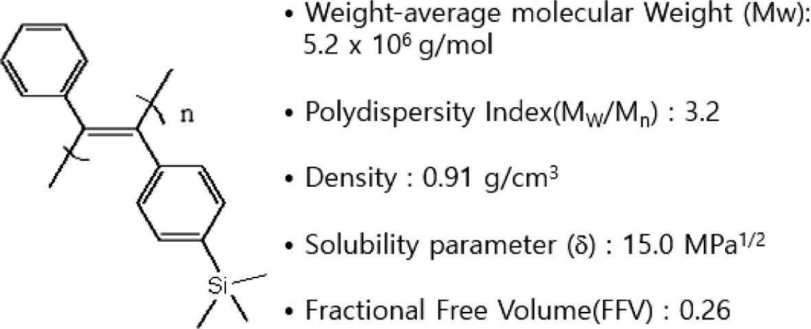 치환 아세틸렌 폴리머 중 폴리디페닐아세틸렌 유도체의 하나인 poly[1-phenyl-2-(p-trimethysilyl)phenylacetylene)](PTMSDPA, Figure 1)는 1991년 Masuda 등에 의해 최초로 합성되었다.1 이 폴리머는 백만 이상의 초분자량과 사슬의 강직성에 기초하여,