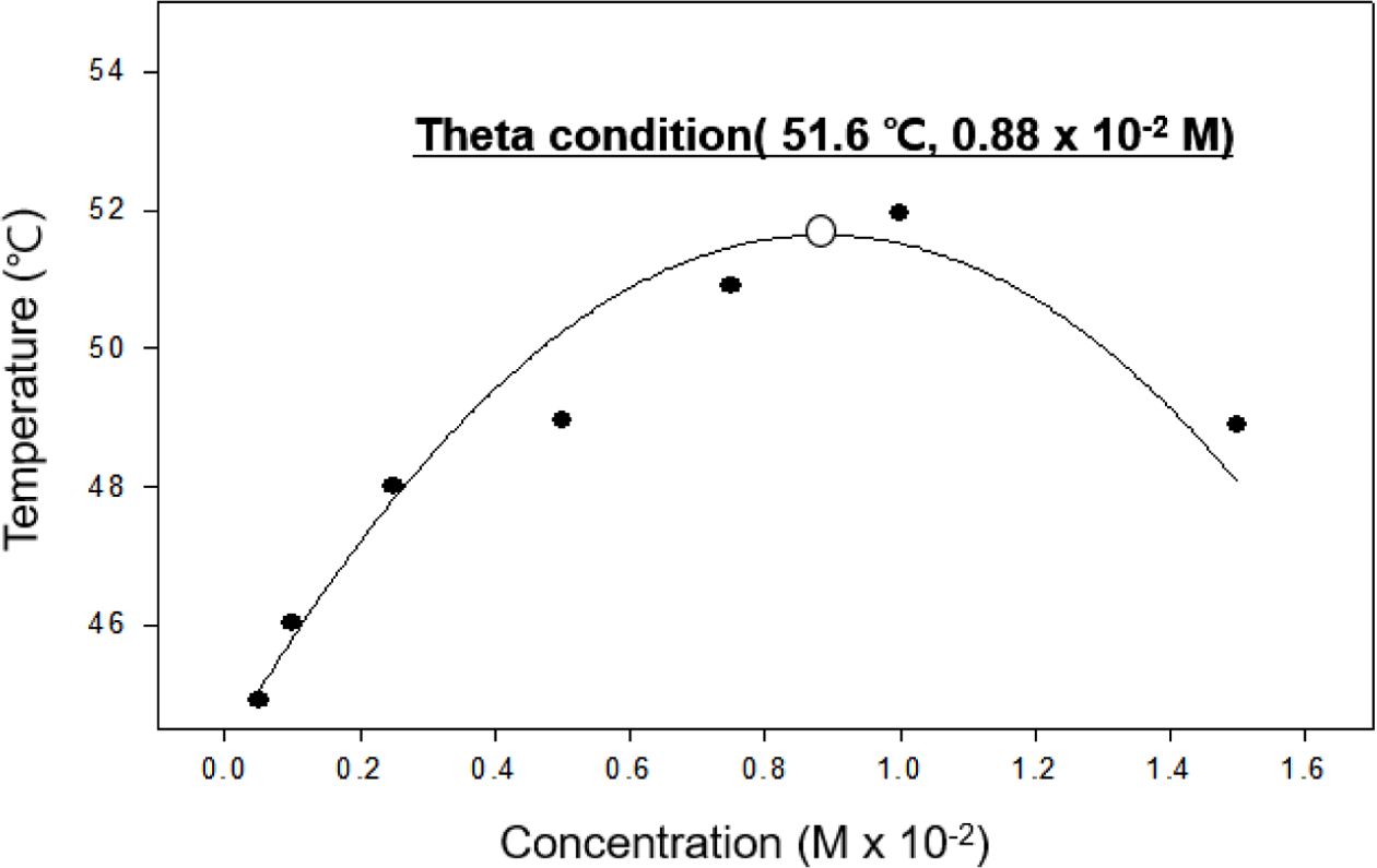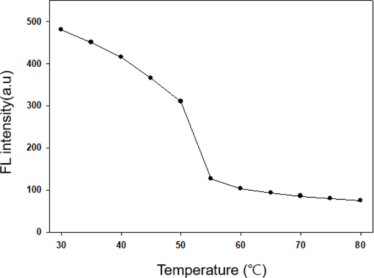 분석 및 측정. 고분자 용액 농도별 온도 변화에 따른 굴절률 변화 시점에 대한 정확한 파악을 위하여 자외-가시광 분광기(UV-Vis spectrophotometer, JASCO-V-650, JASCO International Co., Ltd., Japan)을 이용하여 투과모드(%T)로 측정하였다. 모니터링 파장은 550 nm이며, 온도 변화 실험을 위하여 온도 컨트롤러를 장착하여 실험을 진행하였다. 측정 범위는 80 oC~30 oC에서 분당 1 oC씩 냉각하면서 투과율 변화를 측정하였다. Theta condition에 대한 검증을 위한 발광 특성 실험은 형광 분광광도계(spectroflurometer, JASCO-FP-6500, JASCO International Co., Ltd., Japan)을 사용하여 측정하였으며, 측정 조건은 여기(excitation) 및 발광(emission)의 슬릿 폭을 각각 3 nm로 하였고, 여기 파장과 모니터링 파장은 각각 425, 530 nm로 고정하였다.