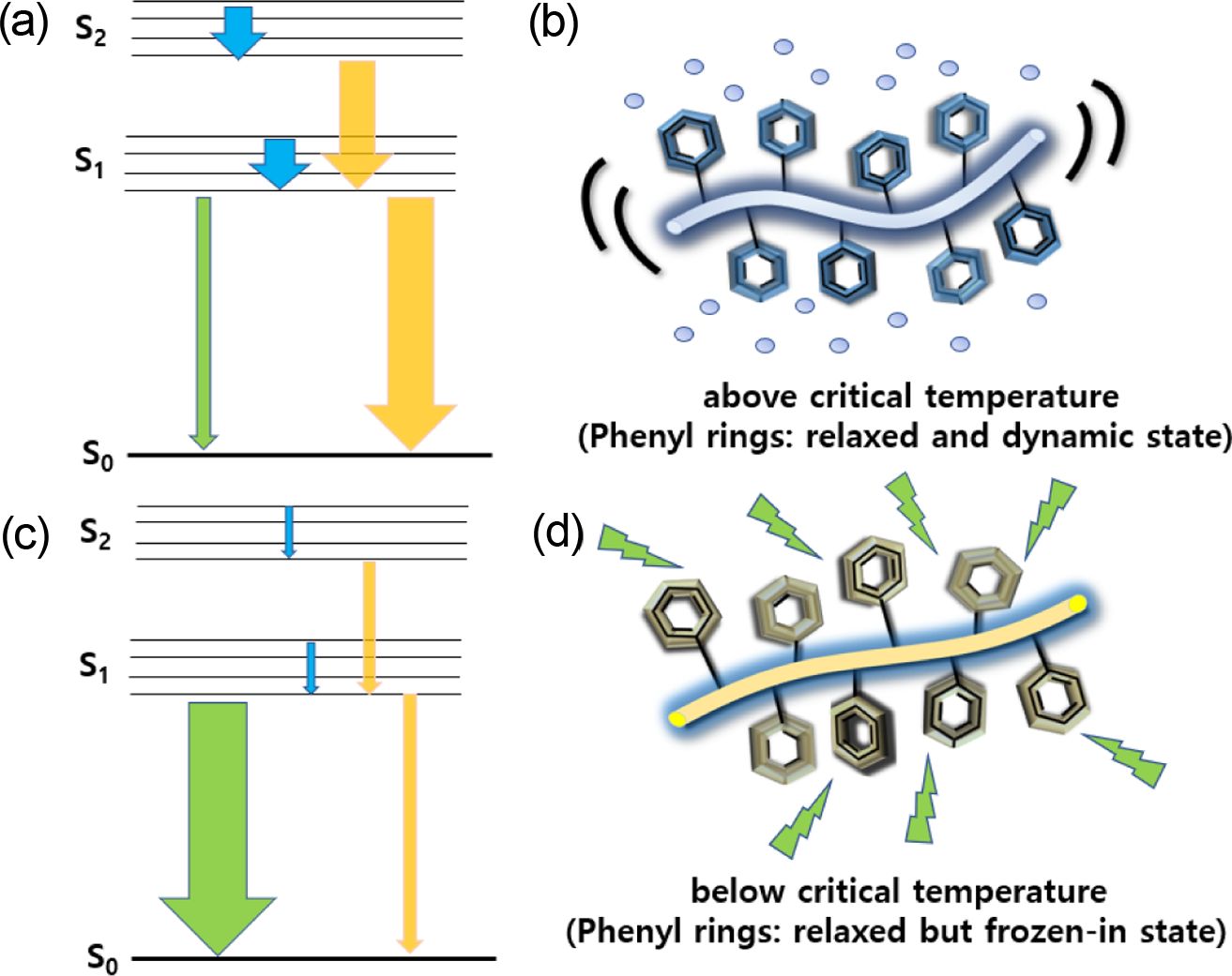 Figure 5 (a), (c) Jablonski energy diagram; (b), (d) proposed schematic diagrams of PTMSDPA solution. (a), (b) above; (c), (d) below critical temperature (green arrow: fluorescence, blue arrow: vibrational relaxation, yellow arrow: solvent quenching) |