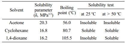 Theta Solvent의 선정.용해도상수(solubility parameter)가 같거나 비슷한 고분자와 용매 두 분자는 서로 간에 유사한 응집에너지가 작용하므로 상용성(miscibility)이 나타날 가능성이 매우 크다. 따라서, 두 분자 사이에 용해도상수 값을 비교함으로써 특정 용매에 대한 고분자의 상용성을 쉽게 예측할 수 있다. 특히, 비극성이며 비정질의 고분자일 경우 그 예측의 정확성이 높아진다. 그러나 분자가 수소결합 등 이차결합이 다수 존재하고, 결정성이며, 전하이동특성 등이 강하게 작용할 경우, 용해도 상수에 의한 상용성을 예측하기에 다소 한계가 있다. 다행히 PTMSDPA는 그 화학구조식에서 알 수 있듯이 전형적인 비극성의 비정질 고분자이므로 theta solvent를 찾는 과정에서 이 폴리머와 상대 용매사이의 용해도상수 차이를 참조하여 후보 용매들을 선정할 수 있었다. 이전 연구에서, PTMSDPA의 밀도는 0.91 g/cm3으로 측정되었고, group contribution method에 의한 계산을 통해 이 폴리머의 용해도상수는 15.0 MPa1/2으로 결정되었다.12 우선 theta solvent의 후보로써 상온(25 oC)에서는 PTMSDPA를 녹이지 않고 팽윤만 일으키는 용매들을 우선적으로 추출하였고, 이들 중에서 PTMSDPA와 용해도 상수가 비교적 가까운 용매들을 실험대상으로 선정하였다(Table 1). 그 결과 실험대상으로 acetone, cyclohexane, 1,4-dioxane이 선정되었으며, 이들을 이용하여 임의의 농도에서 온도에 따른 PTMSDPA의 용해도 변화를 관찰하였다. Acetone에서는 가열을 하여도 녹는 현상이 관찰되지 않았고, cyclohexane에서는 가열 없이도 상온에서 매우 장시간에 걸쳐 천천히 녹는 것을 확인하였다. 따라서, acetone과 cyclohexane은 PTMSDPA에 대해 각각 비용매와 양용매에 해당하는 것으로 볼 수 있다. 반면, 1,4-dioxane에서는 상온에서는 전혀 녹지 않았지만 서서히 온도를 상승시켜 나감에 따라 50 oC 부근에서 점차적으로 녹기 시작하여 80 oC에서는 완전히 녹아 투명한 단일상의 용액을 얻을 수 있었다. 1,4-dioxane에서 완전히 용해된 단일상의 고분자 용액을 상온으로 냉각시켰을 때, 상분리가 일어나면서 석출되는 현상이 육안으로 관찰되었다. 이 결과에 근거하여 1,4-dioxane은 PTMSDPA의 theta solvent가 될 수 있을 것으로 추정하여 하기 상변화 다이어그램을 도출하기 위한 후속 실험을 진행하였다.