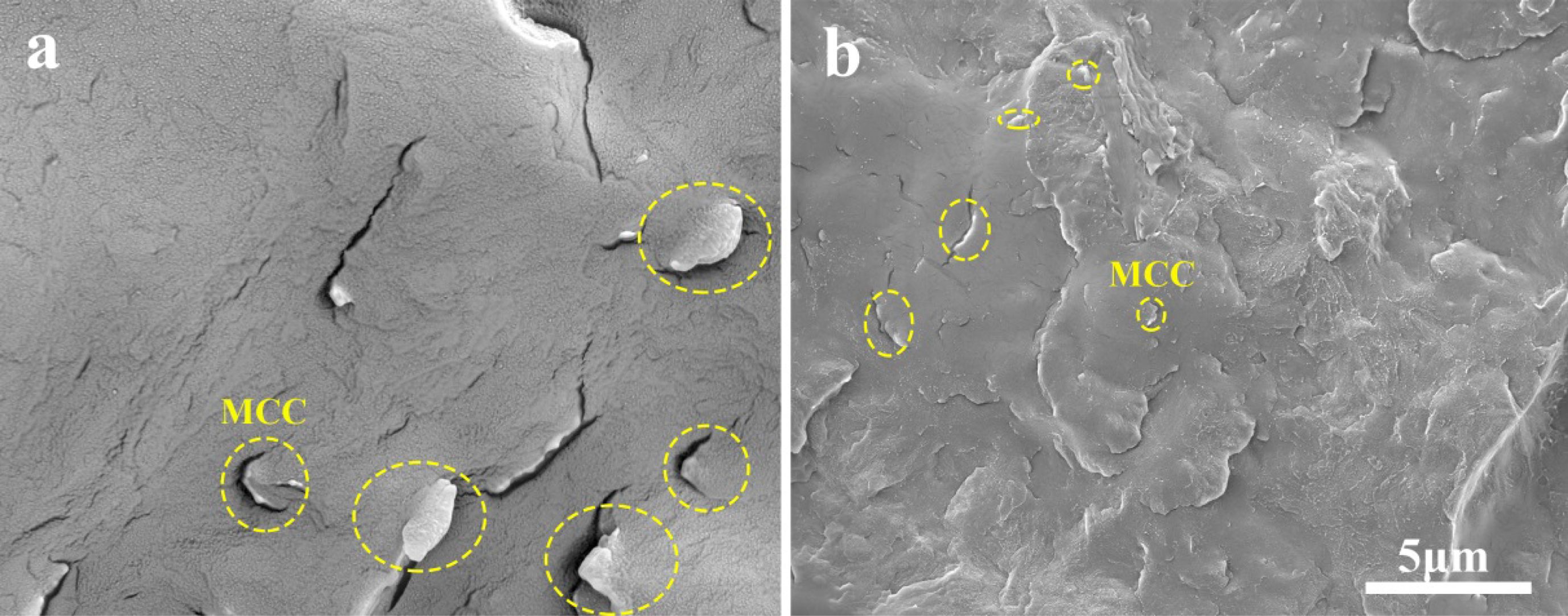 SEM of the iPB/MCC Composites. Figure 3 exhibits the SEM photographs of the iPB/MCC composites. The surface of iPB/MCC5 is rough and has many micro-cracks in Figure 3(a). Contrary to iPB/MCC5, the surface of M-iPB/MCC5 is smoother and the micro-cracks are disappeared in Figure 3(b). Meanwhile, the size and dispersion of MCC between Figure 3(a) and 3(b) have obvious differences. In Figure 3(a), the size of MCC is bigger, and there are some big gaps between MCC and iPB. This phenomenon proves that the serious agglomeration of MCC in iPB matrix results in a poor dispersion, which leads to poor interface compatibility between MCC and iPB. With the addition of MAPB, the size of MCC is decreased greatly and there is no crack between MCC and iPB. It is indicated that MAPB can improve the compatibility of MCC and iPB, which endows the composites more excellent properties.