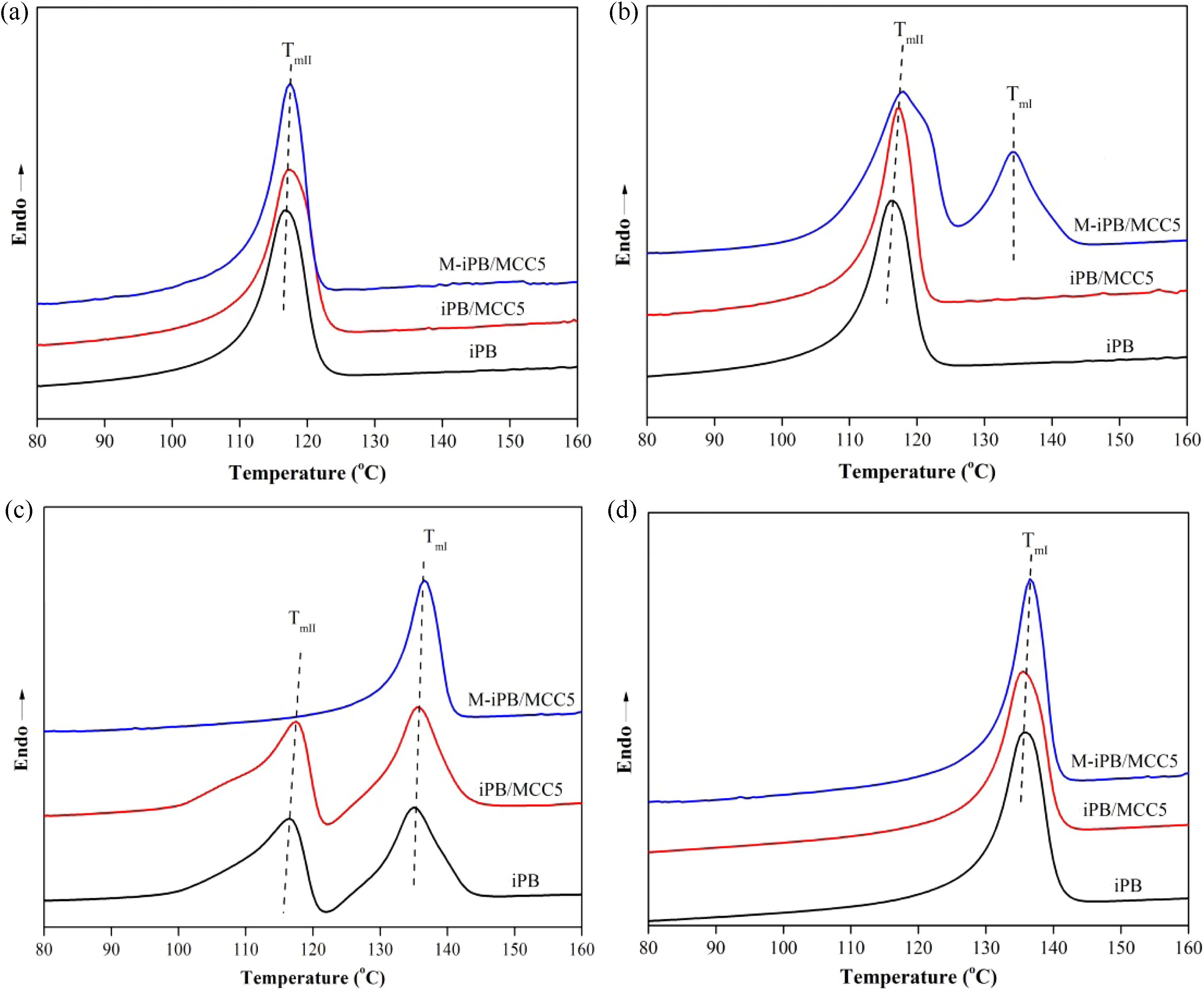 Surprisingly, some important changes appear in the melting curves of the composites with storage for 3 days and 5 days. After storage for 3 days, the endothermic peaks of the form I and form II are observed in the melting curves of M-iPB/MCC5, meanwhile iPB and iPB/MCC5 still have only the endothermic peak of form II. After storage for 5 days, the M-iPB/MCC5 is shown a single endothermic peak of form I which means that the crystal transformation has been completed. Besides, the iPB and iPB/MCC5 are shown two endothermic peaks of the form I and form II. In addition, the increase of TmII or TmI is shown the same rules with the samples storage for 1 day and 7 days. The results indicate that the addition of MCC is beneficial to accelerating the crystal transformation of iPB, but this acceleration is closely related to the interface compatibility between MCC and iPB. The composites with MAPB have completely transformed into the form I in the 5 days of storage which has great significance for shortening the storage time of iPB and speeding up the product circulation in the iPB industry.