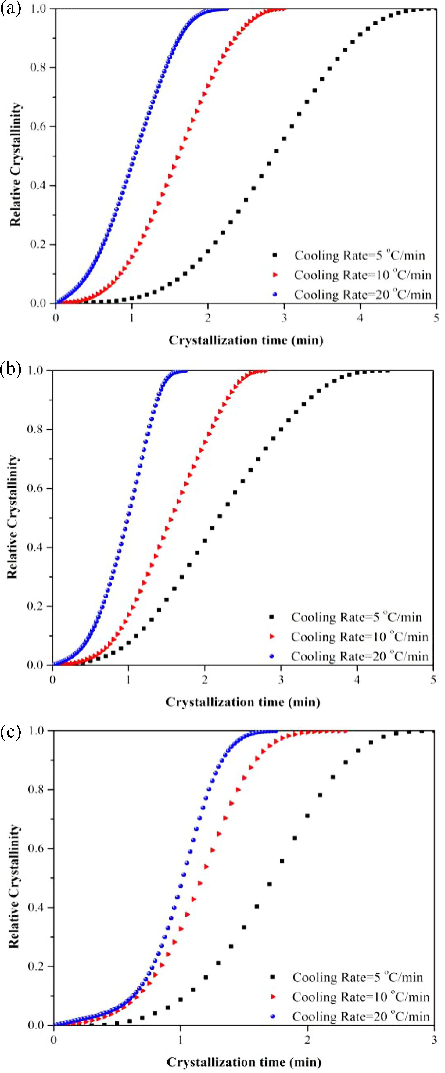 Because crystallization is a non-isothermal process, the relationship between crystallinity X(T) and crystallization time (t) can be converted according to eq. (3). The result is shown in Figure 5.