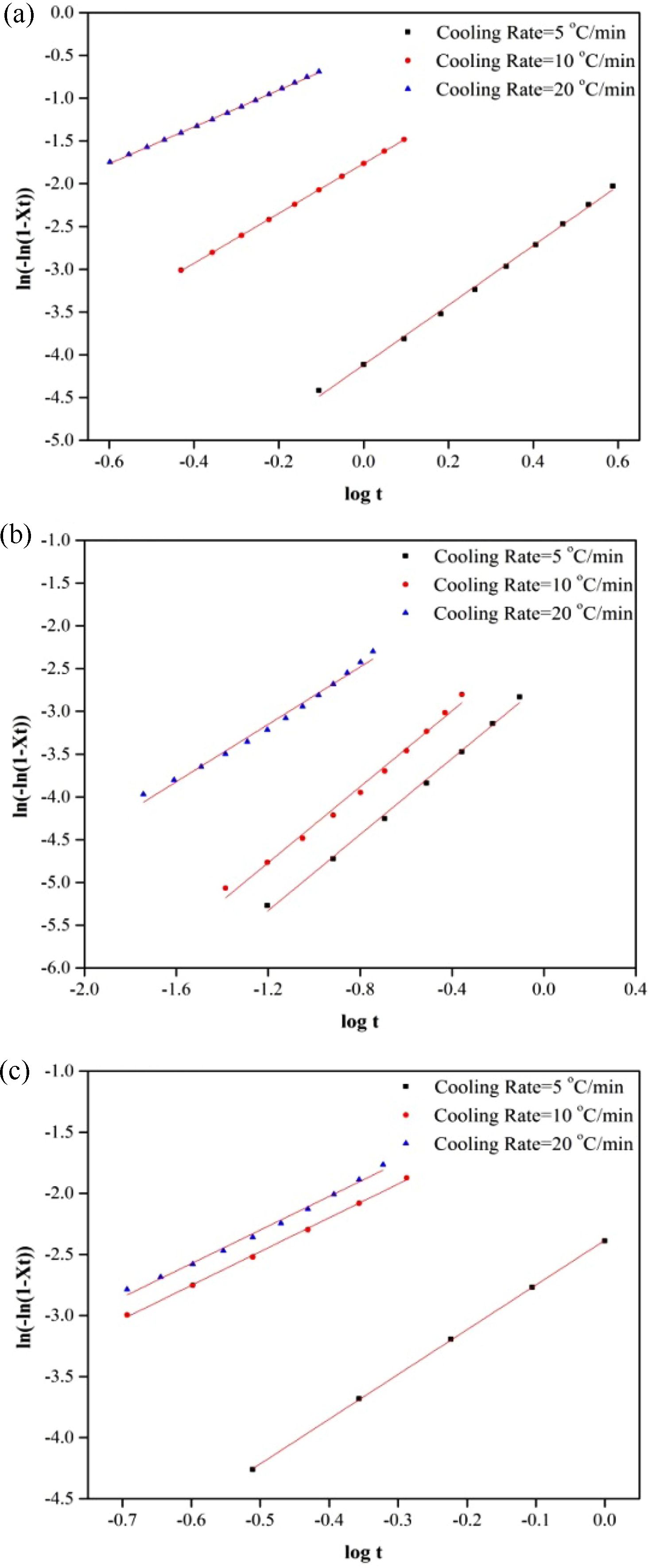 Thelog [-ln(1-X(t))] is plotted with logt via Avrami equation. The Avrami index n can be obtained from the slope and log k can be obtained from the intercept. Then the cooling rate φ is corrected for the obtained kc according to eq. (4).