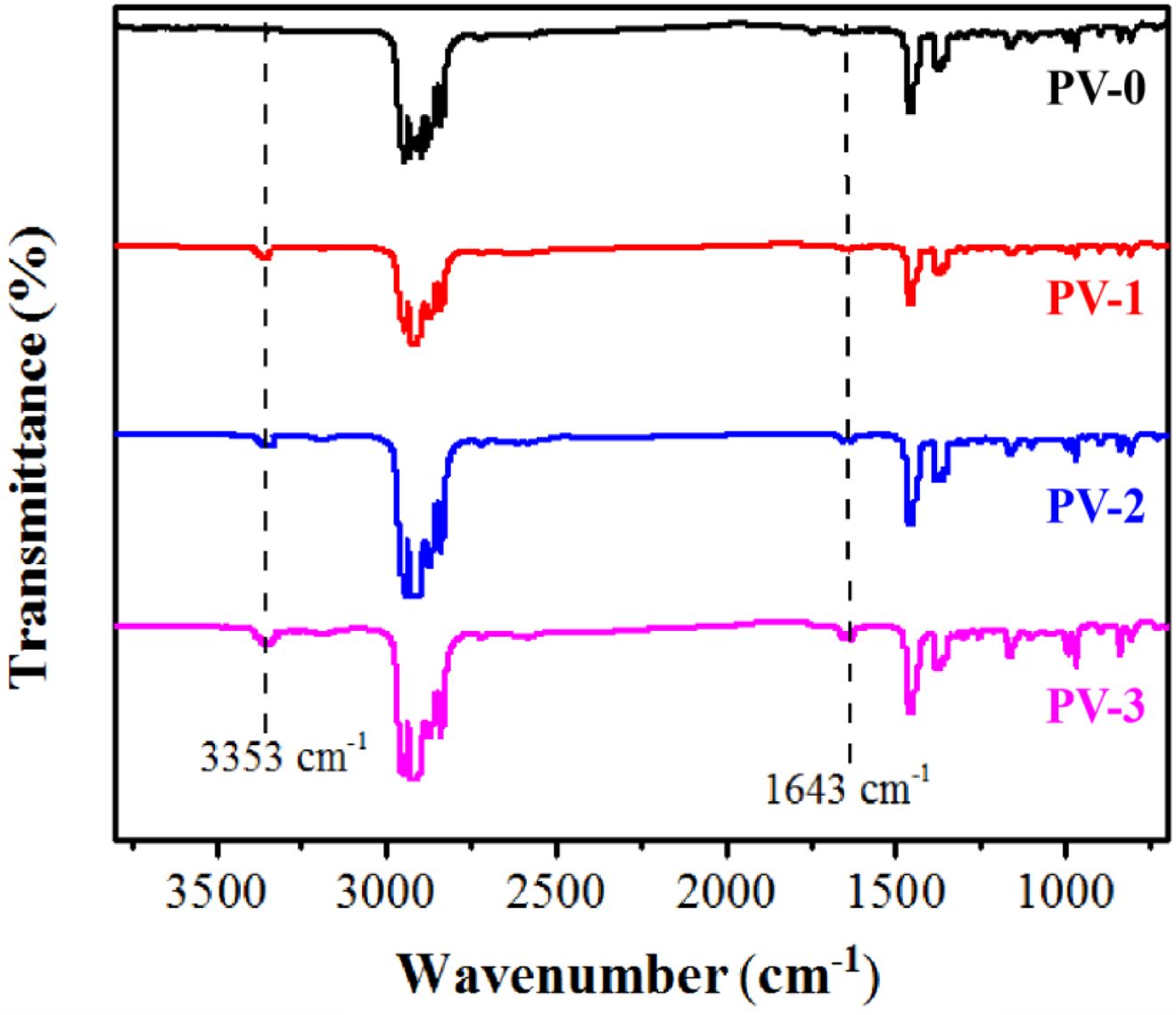 FTIR and Thermal Properties of PP/ VA Materials. The FTIR spectra of PP/VA materials was shown in Figure 2. It could be seen that the main change in the spectra of PV-0 material with VA antioxidant was the characteristic peak of hydroxyl group (-OH) at 3353 cm-1 and the stretching vibration of C=C bond of benzene ring in VA molecule at 1643 cm-1.22 The hydroxyl group (-OH) had high reactivity and was generally considered as the main group to improve the antioxidant capacity of polymers. The hydroxyl group (-OH) provided by VA could give PP/VA materials certain ability of capturing and scavenging free radicals, which could reduce the aging effect of hot oxygen, thus extending the service life.