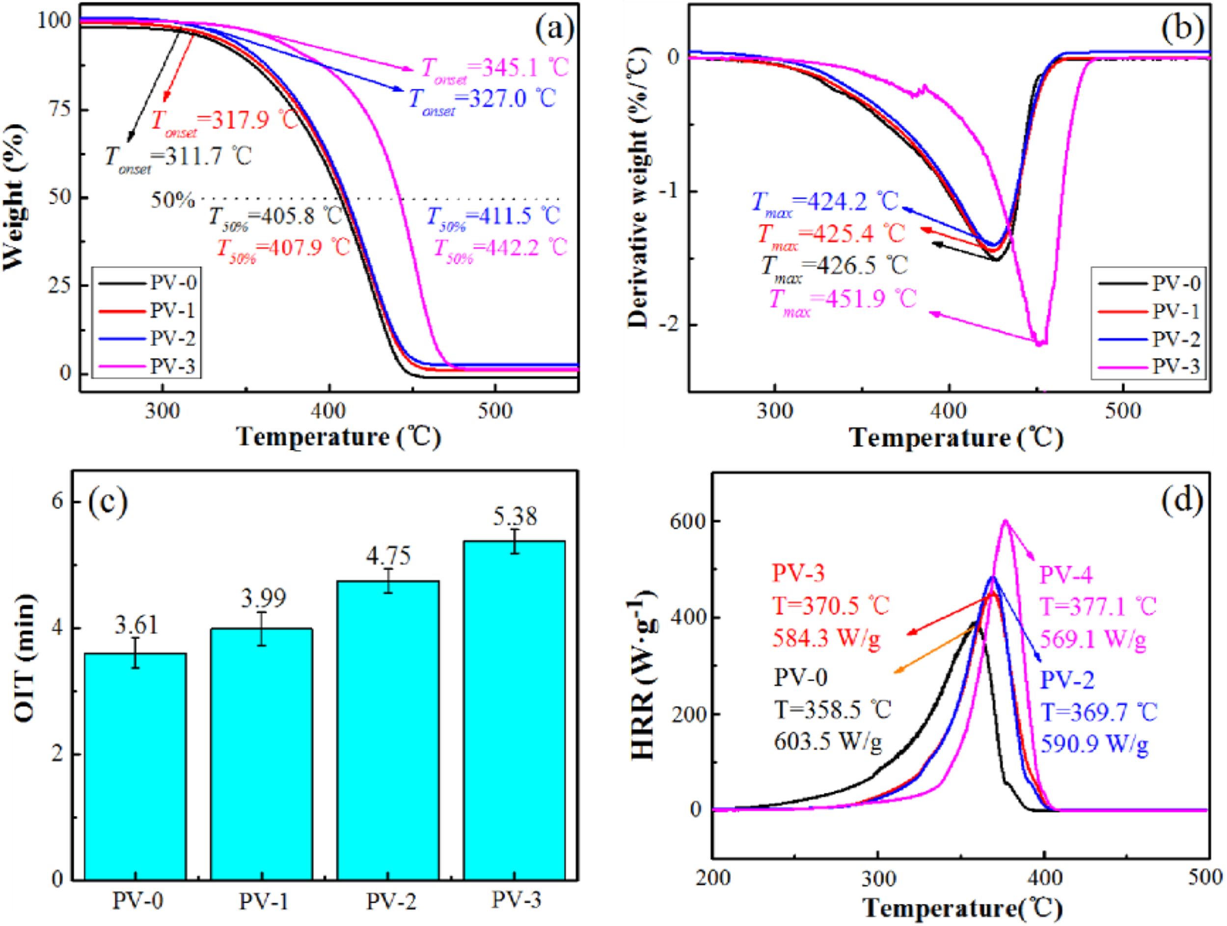 The thermal properties of PP/VA materials were shown in Figure 3. As shown in Figure 3(a) and 3(b), the initial temperature of main thermal decomposition stage (Tonset) and the maximum thermal decomposition rate temperature (Tmax) of PP/VA materials were measured by TGA. The Tonset of PP/VA material was slightly higher than that of pure PP (PV-0), and the increase of Tonset was not obvious when the VA addition amount was low. This would be due to the fact that VA had been partially decomposed by thermal oxygen aging in the processing and molding process, and the enhancement of structure activity in PP molecule was not obvious. However, the Tonset and Tmax of PV-3 were increased by 33.4 ℃ and 25.4 ℃, respectively, compared with PP (PV-0). This was because the molecular coupling and cooperation in the PP/VA materials were enhanced,25 forming a complex and interactive spatial network structure.26 The free movement of PP molecular chain segments was restricted, leading to the increase of temperature and energy required for thermal decomposition,27 which could effectively protect the weight loss of PP molecular chain degradation in the high temperature and oxygen-rich environment and delay the aging failure of PP to a certain extent, enhancing the antioxidant capacity of PP.