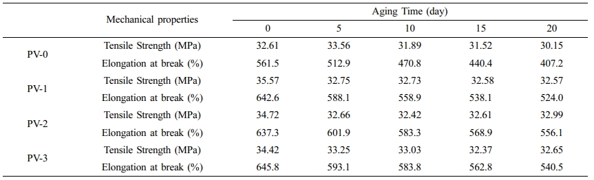 Mechanical Properties of PP/VA Materials Before and After Aging. Table 2 and Figure 5 showed the changes of mechanical properties of PP/VA materials at different times of thermal oxygen aging. As shown in Table 2, the tensile strength and elongation at break of PV-1, PV-2, and PV-3 before aging were increased by 9.1, 6.1, 5.6% and 14.4, 13.5, 15.0%, respectively, compared with PV-0. This was because the addition of a small amount of VA played the role of nucleating agent, which helped PP spherulites grow faster and denser through heterogeneous nucleation. Furthermore, the internal arrangement of PP molecules became regular and the degree of molecular orientation was improved, and the interaction force between molecules increased,34 thus enhancing the tensile strength and elongation at break of PP/VA materials, which was consistent with the results of DSC analysis. With the increase of aging time, the molecular chain of materials had different degrees of unwinding and degradation, leading to the decline of tensile strength and elongation at break.