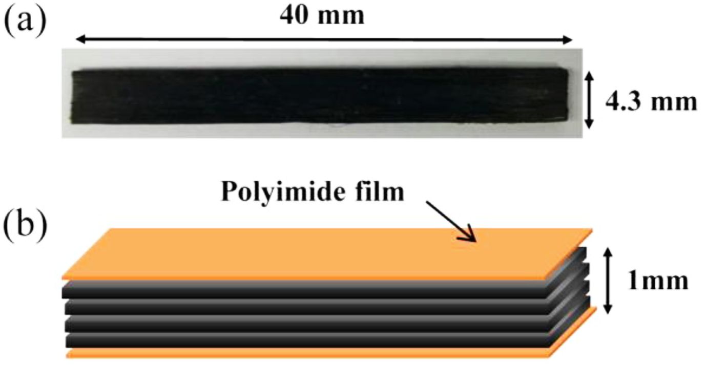 (a) Photographic image; (b) schematic illustration of laminated CFRP composite.