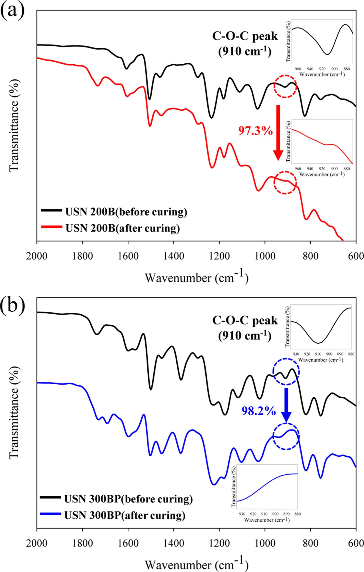 FTIR spectra of (a) USN 200B; (b) USN 300BP before and after thermal curing. The insets are FTIR spectra for the epoxide group before and after heat treatment