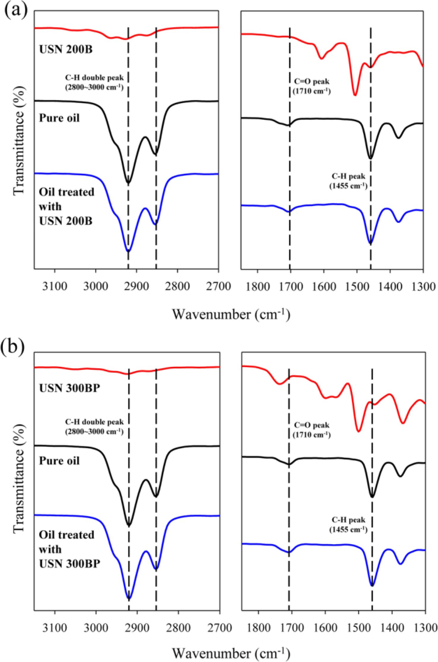 FTIR spectra of oils and composites: (a) USN 200B; (b) USN 300BP before and after oil treatment.