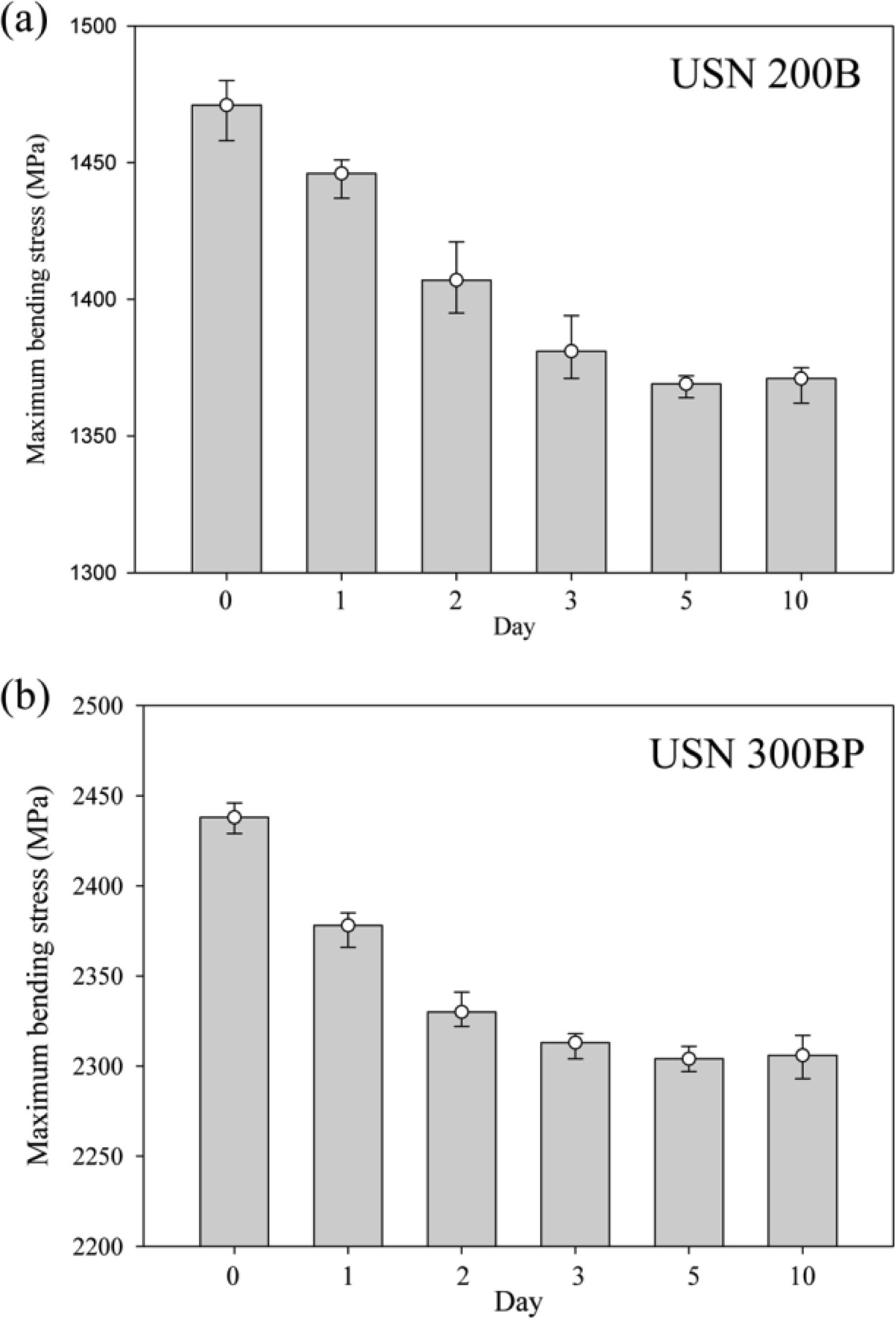 Maximum bending stress of (a) USN 200B; (b) USN 300BP composites after oil treatment.