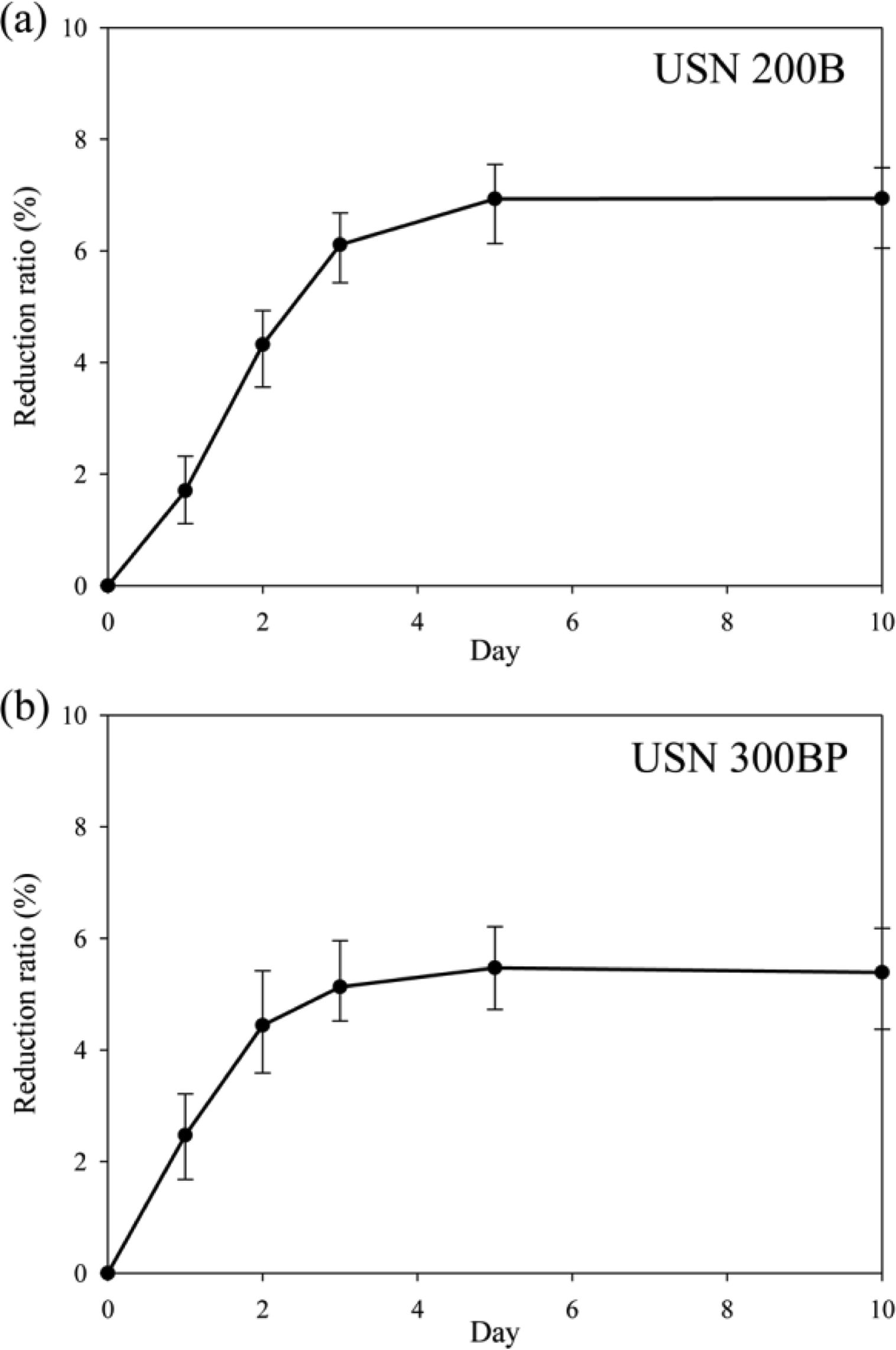 Reduction ratio of flexural strength: (a) USN 200B; (b) USN 300BP