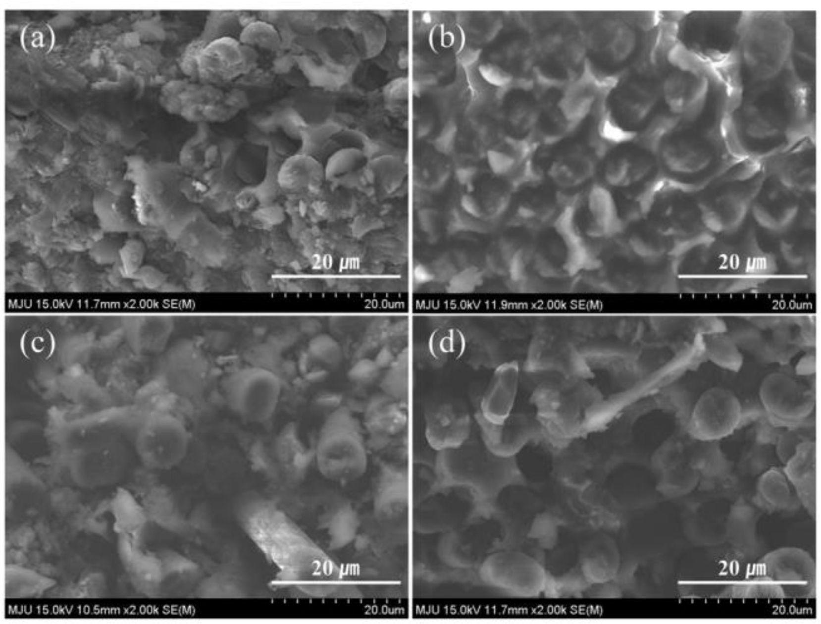 Cross-sectional FE-SEM images of (a) USN 200B before oil absorption; (b) USN 200B after oil absorption; (c) USN 300BP before oil absorption; (d) USN 300BP after oil absorption.