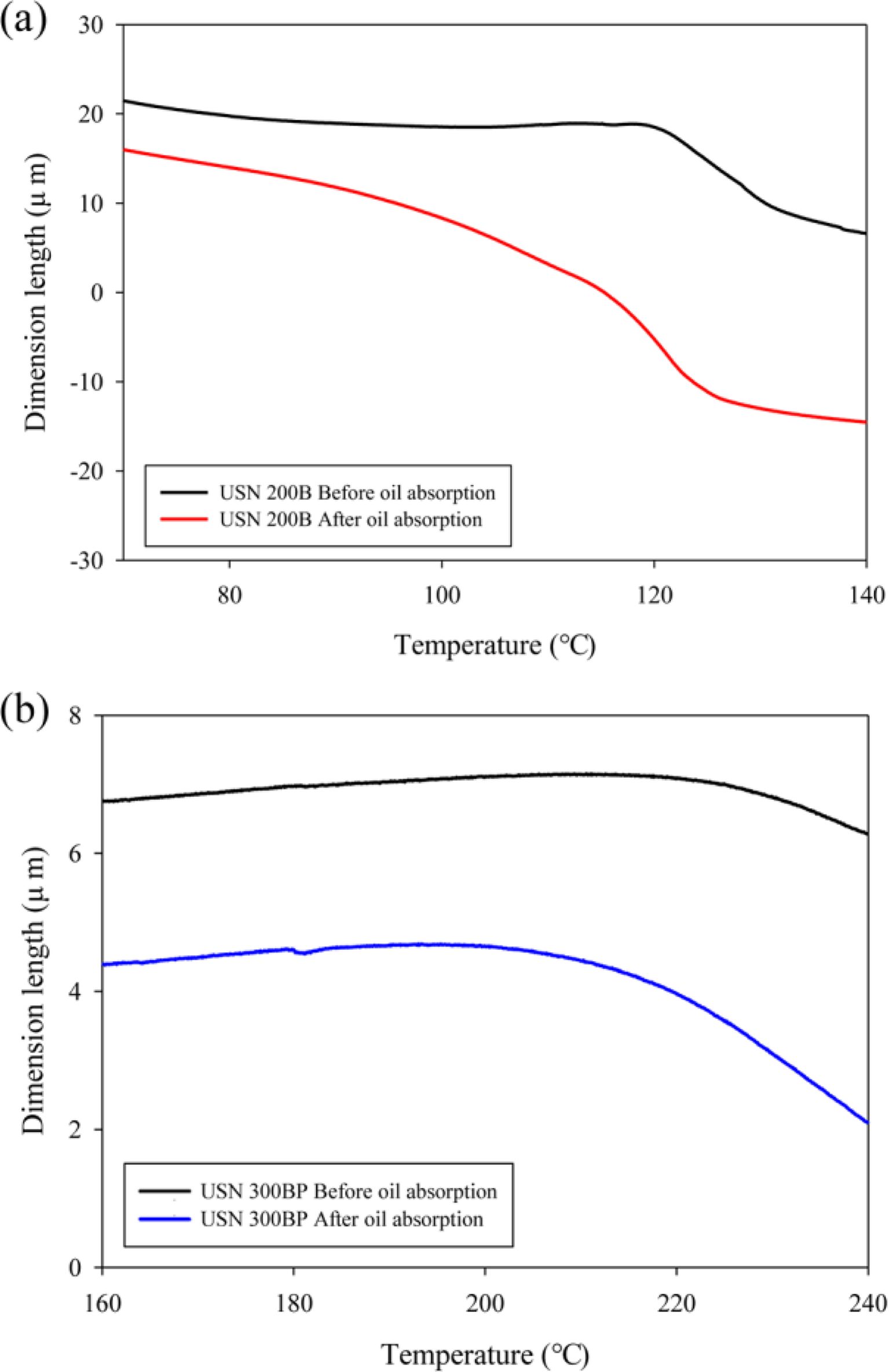 TMA thermograms of (a) USN 200B; (b) USN 300BP before and after oil treatment at 150 oC for 10 days.