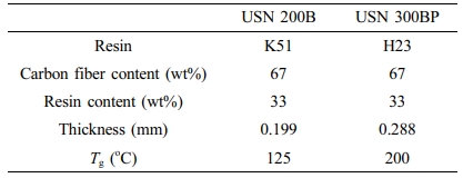 시약 및 재료. 두 종류의 CFRP prepreg(USN 200B, USN 300BP)는 SK케미칼(성남, 대한민국)에서 구입하였다. Table 1에 사용된 CFRP prepreg의 재료 특성을 나타냈다. USN 200B는 Tg가 125 oC인 K51 에폭시 수지를 사용하고, 이 수지는 bisphenol A의 diglycidyl ether와 경화제를 함유하고 있다. USN 300BP는 Tg가 200 oC로 열안정성이 높은 H23 에폭시 수지를 사용하고, 이 수지에는 열적으로 안정한 cyanate ester 수지 및 경화제가 함유되어 있다. 두 종류의 CFRP 재료 내 탄소섬유 함량은 동일하게 중량비로 67%이다. 자동차용 윤활유(SK ATF-SP3)는 SK루브리컨츠(서울, 대한민국)에서 구입하였다. 0.025 mm 두께를 갖는 폴리이미드 필름은 알파프론(서울, 대한민국)에서 구입하였다.