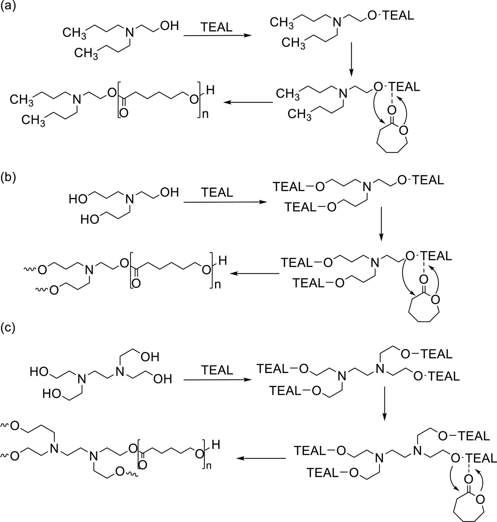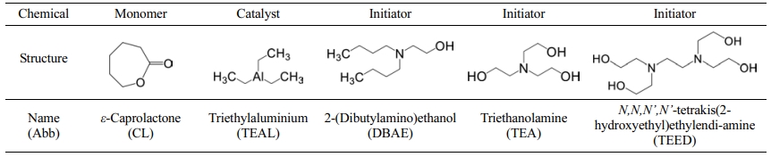 시약 및 재료. 단량체로는 ε-caprolactone(97%, Aldrich, 미국)을 이용하였고, 촉매는 TEAL(Aldrich, 미국)을 toluene(J.T. Baker, 미국)에 희석시켜 사용하였다. 개시제는 2-(dibutyl- amino)ethanol(DBAE, Aldrich, 미국), triethanolamine(TEA, Aldrich, 미국), N,N,N’,N’-tetrakis(2-hydro-xyethyl)ethylendi- amine(TEED, Aldrich, 미국)을 정제 없이 사용하였다. 이러한 화합물의 구조를 Table 1에 나타내었다. TEAL을 희석하기 위한 toluene은 질소 분위기에서 sodium(Aldrich, 미국) 및 benzophenone(Aldrich, 미국)을 이용해 6시간 이상 환류증류한 후 사용했다. 중합되지 않은 단량체를 제거하기 위해 choloform(Samchun Chemical, 대한민국)을 정제 없이 사용하였다. 고분자를 침전시키기 위해 methanol(Samchun Chemical, 대한민국)을 정제 없이 사용하였다.