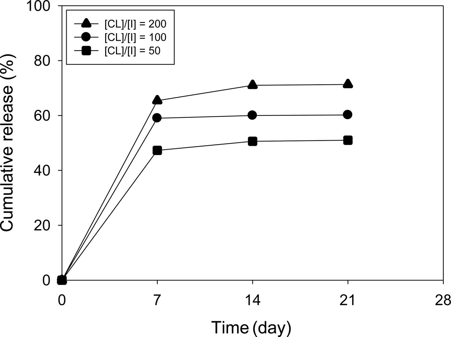 먼저 선형 PCL의 경우 [CL]/[I]의 비가 증가할수록 즉, 선형 PCL의 분자량이 커짐에 따라 빠르게 BSA가 방출되고 최대 방출량%가 큼을 알 수 있다. 이는 로딩분율과 반대 경향으로 Table 4에서 볼 수 있듯이 [CL]/[I]이 낮을수록 로딩분율이 크다. Table 2에서와 같이 선형 PCL의 경우 분자량이 증가하면 결정화도가 감소하고 이로 인해 방출속도가 증가하는 것으로 보인다.