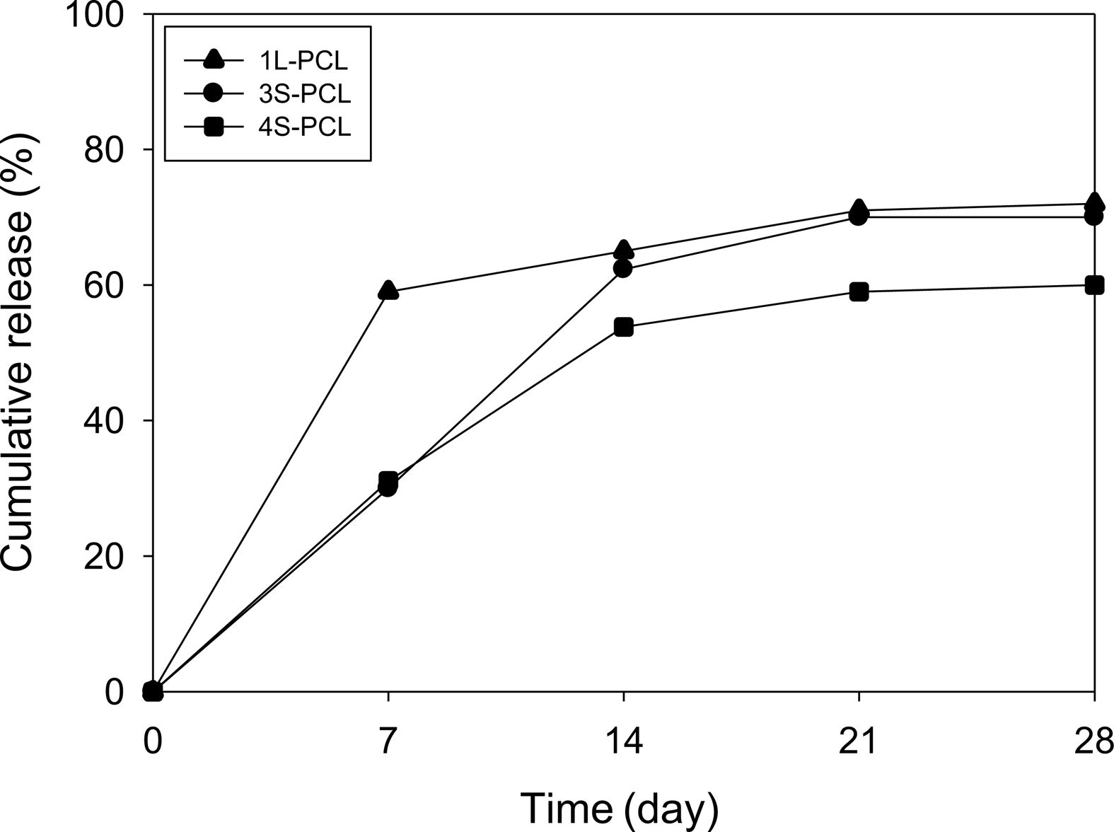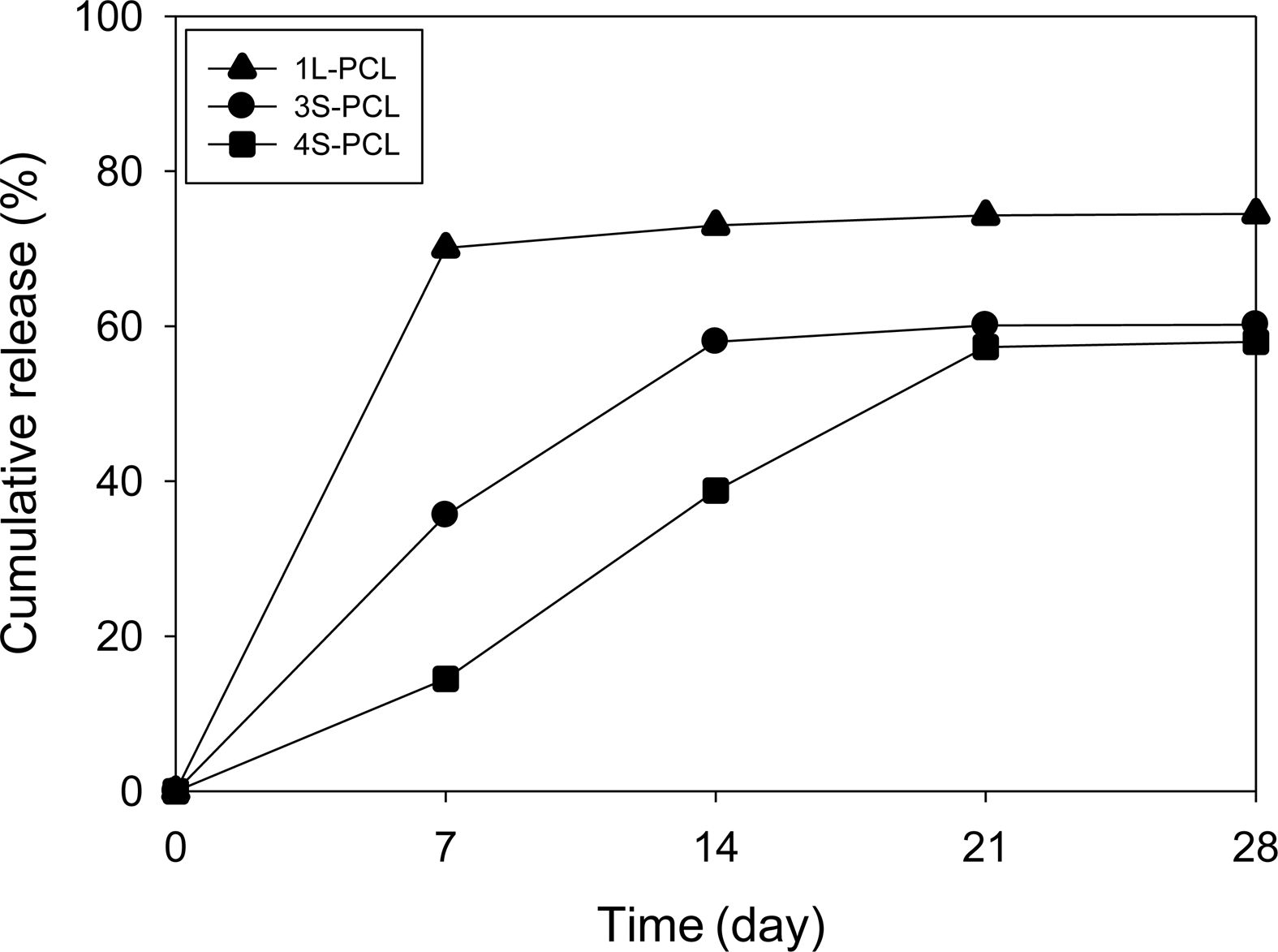 Figure 4와 5는 선형, star형 PCL의 방출속도 차이를 보여주고 있으며 선형 PCL의 방출속도가 상대적으로 빠르고 star형 PCL의 방출속도가 느렸다. 동일한 star형 PCL의 경우 가지가 많은 4S-PCL이 3S-PCL보다 느려졌다. 이는 벌크중합, 용액중합으로 합성된 고분자들이 서로 유사한 경향을 보였다. 즉, 약물 방출속도는 1L>3S>4S로 동일한 경향을 보인다. 가지가 많은 star형 PCL이 방출속도를 느리게 하는 특징이 있음을 알 수 있다. 이는 단백질인 BSA가 star형 PCL에 로딩될 때 선형 PCL보다 BSA와 PCL 분자 간의 얽힘이 심하게 되고 이로 인해 방출속도가 느려지는 것으로 판단된다. 따라서 PCL의 분자구조가 약물 방출속도롤 조절할 수 있는 주요 인자로 활용이 가능하다는 것을 확인하였다.
