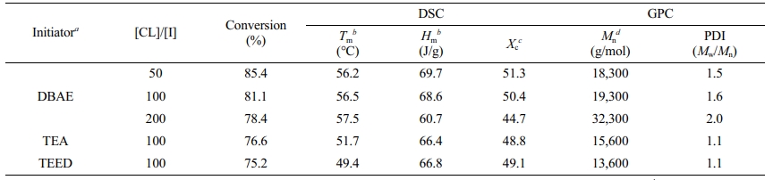개시제의 OH기 수에 따른 중합특성을 비교하기 위하여 [CL]/[I]를 100으로 고정하여 3종류의 개시제 중합을 진행하였다. 전환율은 OH기가 3, 4개인 TEA와 TEED의 경우 DBAE와 유사한 수준이거나 약간 낮았다. 녹는점은 TEA와 TEED가 낮았다. 이러한 차이는 선형 PCL과 star형 PCL 구조가 생성하는 결정의 두께에 영향을 주고 star형 PCL이 좀 더 두께가 작은 결정을 만드는 것으로 판단된다. 반면에 결정화 정도는 큰 차이가 없다. 분자량은 TEA와 TEED 개시제가 낮은 분자량을 생성하였다. 이는 각 OH기 별로 중합도를 비교했을 때 선형고분자가 크고 star형 PCL의 상대적으로 작은 중합도를 갖는 것을 알 수 있다. PDI는 star형 PCL이 더 작았다.