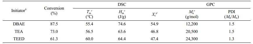 aPolymerization condition: ε-caprolactone=2.74 g (24 mmol), [CL]/[Cat]=50, [CL]/[I]=200, polymerization temperature=105 oC, polymerization time=3 h, toluene=10 mL. binitiator condition; DBAE=0.024 mL (240 μmol), TEA=0.016 mL (240 μmol), TEED=0.026 mL (240 μmol). cdetermined by DSC. dXc=(ΔHmHmo)×100; ΔHmo=136 J/g. edetermined by GPC analysis with polystyrene standard.