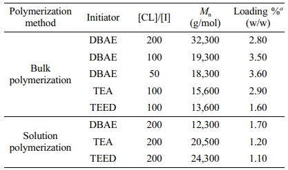 마이크로입자 제조 및 약물 방출 거동. 벌크중합과 용액중합에서 얻어진 선형 및 star PCL 고분자를 약물 전달 시스템의 전달체로 사용하여 실험을 진행했다. PCL 고분자를 W/O/W double emulsification technique과 이용하여 마이크로입자를 제조하며 이때 단백질인 BSA(bovine serum albumin)을 로딩하고 이의 방출거동을 확인하였다. 고분자별 로딩분율은 Table 4에 나타내었다.