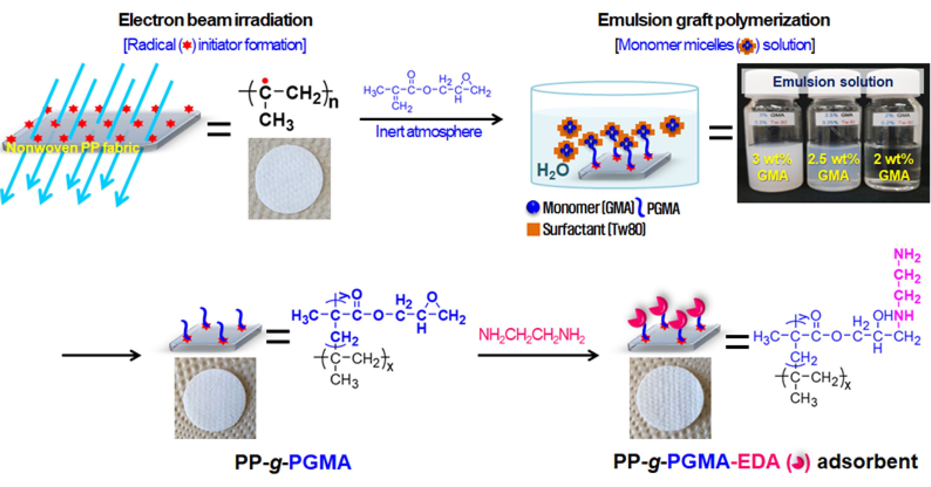 The preparation of PP-g-PGMA-EDA adsorbent was performed incrementally, as depicted in Figure 1. To form the radical initiators, the PP fabric was irradiated by electron beam irradiation under the inert condition. To produce the PP-g-PGMA, the irradiated fabric was placed into the emulsion solution in water containing monomer micelles, and the formed radicals at the tertiary carbons of the PP backbone structure readily initiated graft polymerization of GMA. As shown in the inset for the emulsion solutions, the 2.5 wt% GMA at the monomer-to-surfactant ratio of 10, was determined to be the minimum concentration for the stable emulsion solution in water. Finally, to introduce the metal-ion adsorbing functionality, the resulting PP-g-PGMA was functionalized through an amine reaction between epoxy groups of PP-g-PGMA and the amine groups of EDA, thereby producing the PP-g-PGMA-EDA adsorbents. Furthermore, there was no significant change in its physical appearance (compared to those of the pure PP and PP-g-PGMA) as shown in the inset of the photographs of the PP, PP-g-PGMA, and PP-g-PGMA-EDA adsorbent.
