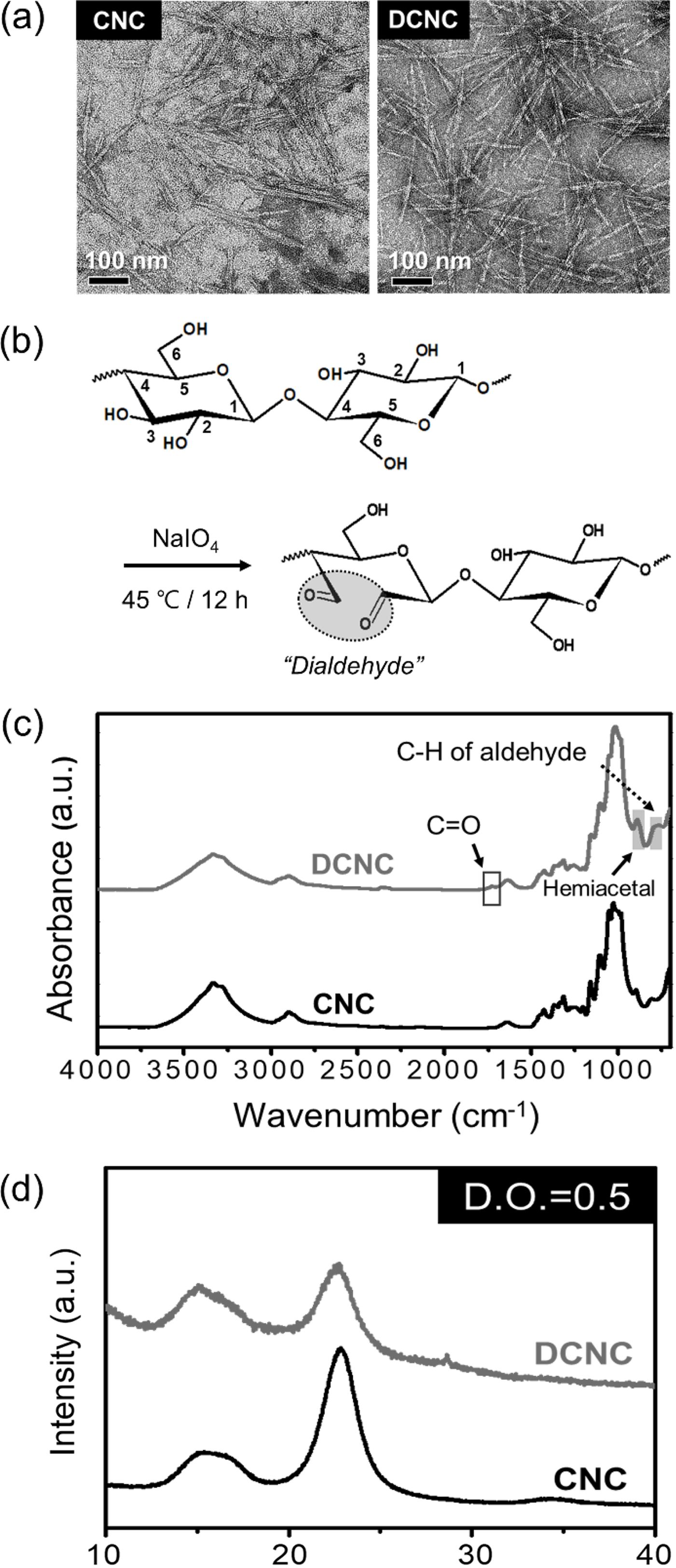 Figure 1 Characterization of CNC and DCNC: (a) TEM images; (b) oxidation reaction scheme of CNC to DCNC; (c) FTIR spectra; (d) XRD patterns of CNC and DCNC. |
