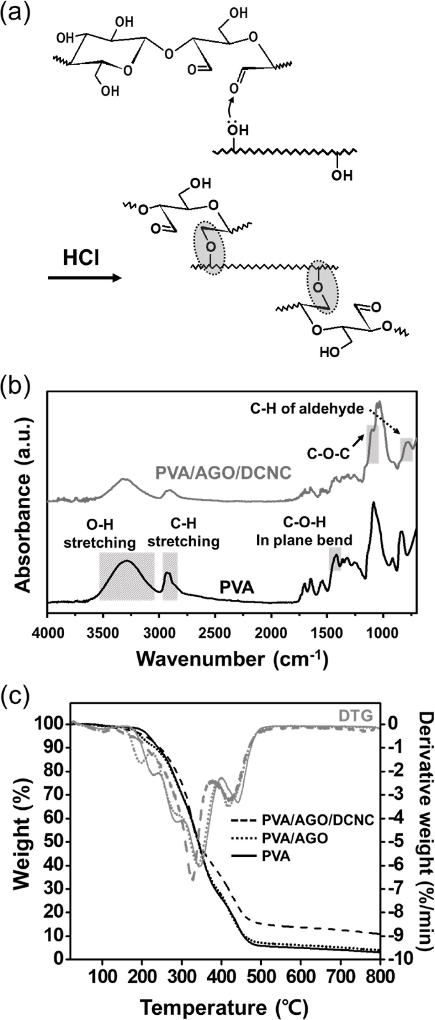Figure 2 (a) Scheme of acetal crosslinking reaction of PVA and DCNC; (b) FTIR spectra of PVA and PVA/AGO/DCNC blend films; (c) TGA/DTG curves of PVA, PVA/AGO, and PVA/AGO/ DCNC blend films. |