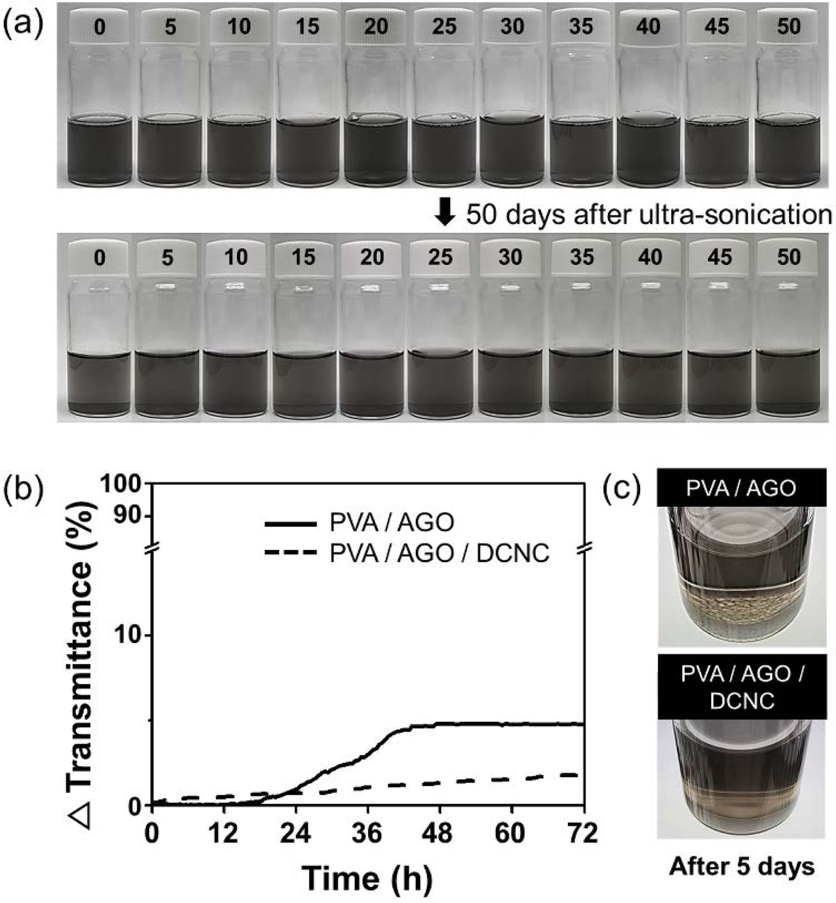Figure 3 (a) Change in dispersion stability of PVA/AGO/DCNC solutions with various contents of DCNC compared to PVA content (weight ratio) after ultra-sonication treatment; (b) turbiscan data of PVA/AGO and PVA/AGO/DCNC solution; (c) difference in dispersibility of the solutions with and without DCNC. |