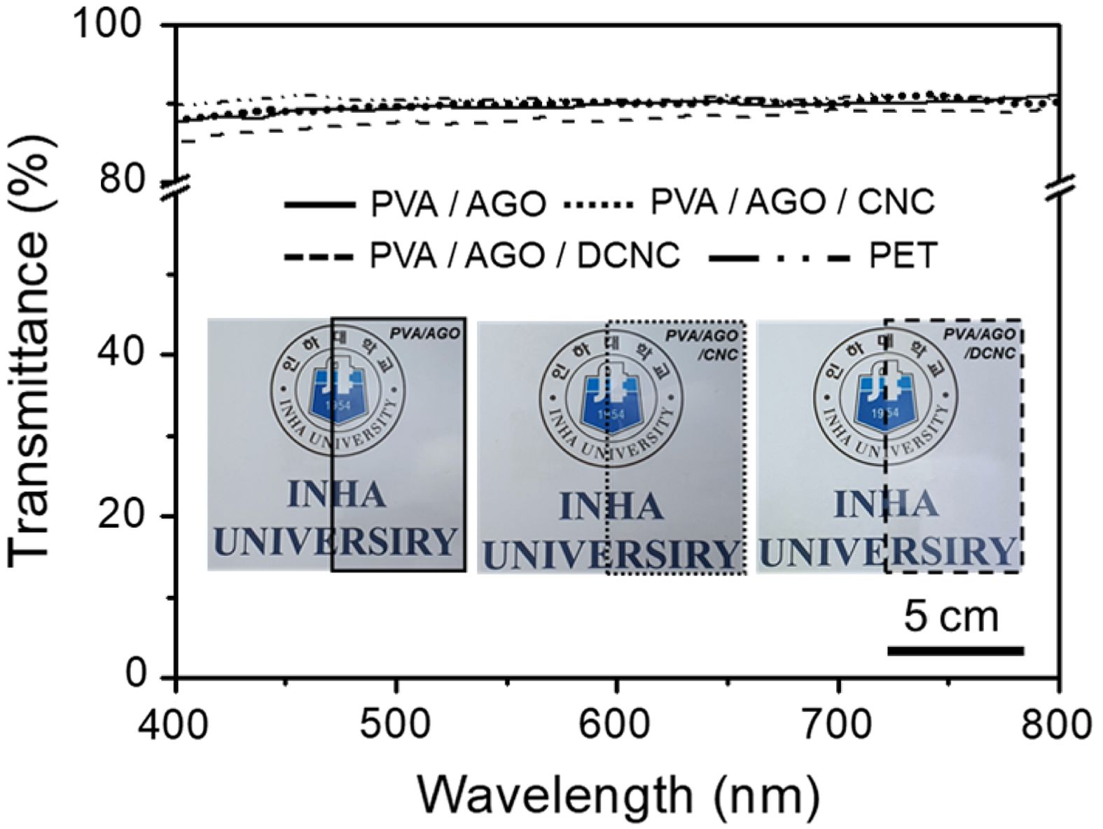 PVA/AGO/DCNC 코팅 필름의 특성 분석.Figure 4에 각 코팅 배리어 필름들의 가시광선 범위(400-800 nm의 파장영역)에서의 광투과 특성을 나타냈다. 그래프에서 나타나는 바와 같이 PET 기재 필름은 550 nm에서 90.6%의 투과도를 가진다. PVA/AGO 복합 용액을 코팅하였을 경우 550 nm에서의 투과도는 89.4%로 가시광선 영역에서의 광투과도가 거의 일정하게 유지되었다. CNC를 소량 분산시킨 PVA/AGO/CNC 복합 용액을 코팅한 경우 550 nm에서 89.8%의 투과도를 갖는다. 이는 매트릭스와 필러 간의 상호작용에 의해 필러가 응집되지 않고 PVA 용액에 잘 분산되어 있음을 보여준다. PVA/AGO/DCNC 복합 용액을 코팅한 경우, 코팅 배리어 필름의 투과도는 550 nm에서 87.9%를 가지지만 여전히 90%에 근접한 우수한 광투과 특성을 나타낸다. 앞서 확인한 PVA/AGO/DCNC 복합 용액의 우수한 분산 안정성이 배리어 필름의 높은 광투과도로 이어지는 것을 확인할 수 있었으며, 따라서 광 투과 특성이 필요한 배리어 필름으로의 응용에 적합할 것으로 기대할 수 있다.
