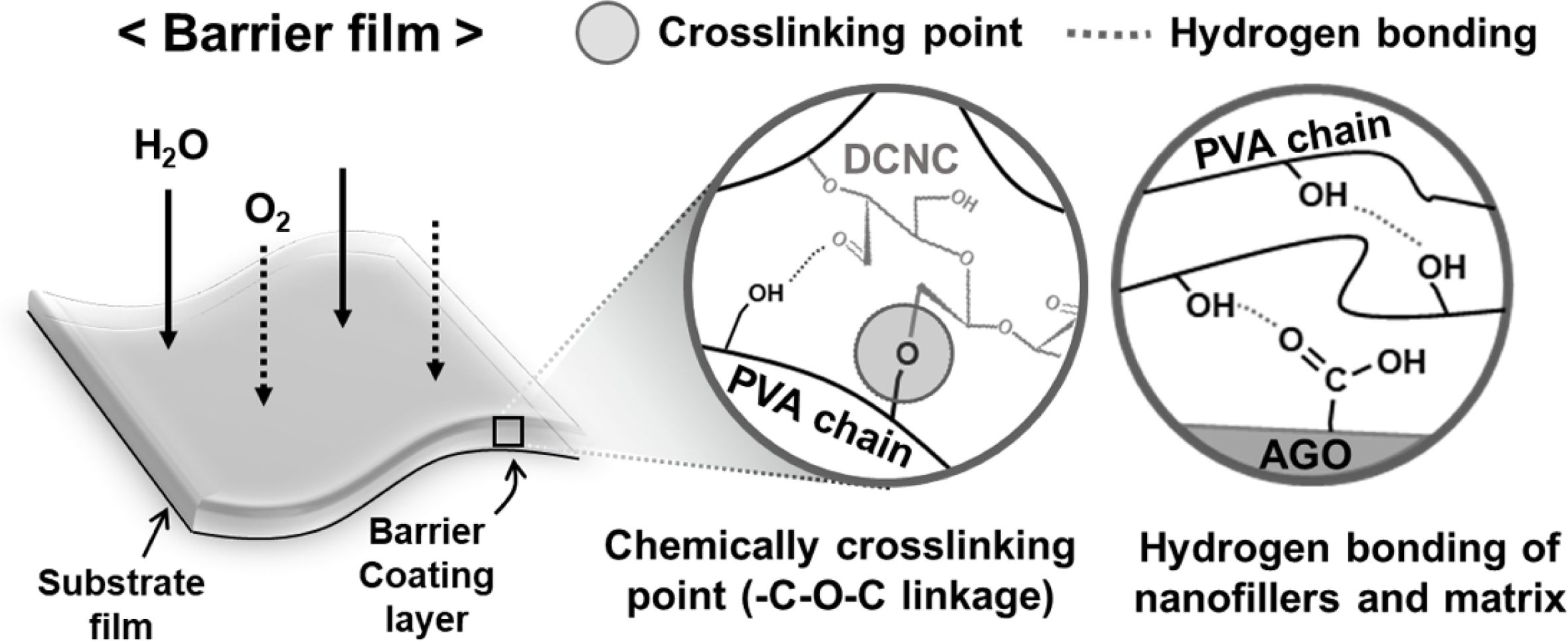 한편 수분 차단성이 큰 고분자 매트릭스로 PVDC를 사용하여 용액 공정을 통해 기재필름 위에 코팅을 진행할 때 유기 용매를 사용해야 하며 이로 인해 환경 친화적인 식∙의약품 포장재 등의 분야에 대해 적용하는 것에 한계가 있었다.12 또한 소각을 통해 폐기하는 과정에서 다이옥신 같은 유독성 물질을 발생시키기 때문에 환경 오염 문제를 유발한다는 문제가 있다.6 PVA는 독성이 적고 화학적, 열적 안정성과 필름 형성 능력이 뛰어나며 필름 상태에서 우수한 인장강도를 가진다는 장점이 있어16 다양한 산업 분야에서 널리 사용되는 고분자이다. 수용성 고분자인 PVA를17 배리어 필름에 활용하면 물을 용매로 한 용액 공정을 진행할 수 있고, 환경 친화적인 필름을 제작할 수 있다. 하지만 고분자 사슬 내 다량의 수산기로 인해 강한 친수성을 나타내기 때문에 습한 환경에서 물 분자의 침투가 쉽고, 그로 인해 고분자 사슬이 팽윤을 일으키면 배리어 특성과 기계적 성질이 저하된다는 단점이 있다.18 이러한 한계를 극복하기 위해 제조된 EVOH는 비닐 알코올(vinyl alcohol)과 에틸렌(ethylene)의 무작위 반복 서열을 가진 랜덤 공중합체(random copolymer)로, ethylene 반복 단위 32-38 mol%의 함량에서 PVA와 유사한 기체 차단성을 가지면서, PVA 대비 우수한 수분 차단성을 가진다. 하지만 제조 원가가 높아 대부분 수입에 의존하고 있으며 고온이나 고습 하에서는 배리어 특성이 떨어져 여전히 고분자 단독으로 원하는 수준의 배리어 특성을 발현시키기에는 무리가 있다.10 따라서 PVA의 가교 반응을 통해 물에 대한 저항성을 향상시키고자 하는 시도가 다음과 같이 있었다. 일반적으로 PVA의 화학적 가교제로 글루타르알데히드(glutar- aldehyde),19-22 글리옥살(glyoxal),23 헥사메틸렌 디이소시아네이트(hexamethylene diisocyanate)24 및 붕산(boric acid)25,26 등이 사용될 수 있으며, 특히 글루타르알데히드나 포름알데히드(formaldehyde)와 같은 알데히드 계열의 가교제를 주로 이용한다. 하지만 이러한 화학적 가교제는 독성을 가지고 있어 식∙의약품의 배리어 필름에서 사용하기 어려우며, 환경 오염을 일으킨다는27 단점이 있다. 이러한 측면에서, PVA의 결정성을 높여서 물에 대한 안정성을 높이는 열처리 방식을 사용하기도 하지만, 이 경우 회합에 의한 물리적 가교 결합이 PVA의 결정화를 방해하여 결정성을 낮추고, 그 결과 기계적 강도를 저하시킬 수 있다.28 따라서 식∙의약품의 배리어 필름으로 사용하는 경우, 일반적으로 독성을 가지는 가교제를 대체하여 독성이 없거나 적은 생체친화적 가교제를 사용하는 것이 바람직하다. 제니핀(genipin)이 저독성 가교제로 먼저 도입되었으나, 제한된 가용성과 높은 비용으로 인해 대규모의 사용이 제한된다는 한계가 존재하였다.29 그에 반해 셀룰로오스를 부분적으로 산화시킨 dialdehyde cellulose nanocrystal (DCNC)는 가용화가 간단하여 최근 친환경적인 가교제로 주목받고 있다.30,31 DCNC는 풍부한 셀룰로오스 계열의 가교제로 저렴하고 접근성이 좋을 뿐 아니라, 일반적으로 사용되는 가교제인 글루타르알데히드보다 세포 독성이 6-12배 낮아29 의료용에도 사용될 수 있다.