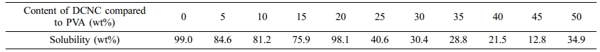 DCNC의 가교 효과를 알아보고, PVA 대비 최적의 DCNC 함량 비율을 선정하기 위해 DCNC 무게 함량이 각기 다른 PVA 복합 필름을 제작하여 용해도 테스트를 진행하였다. 1 M HCl 수용액을 산 촉매로 첨가한 후 2시간 동안 교반하여 가교 반응을 진행하였고, 복합 필름은 페트리디쉬에 캐스팅하여 60 oC 대류오븐에서 24시간 동안 건조한 후, 60 oC 진공 오븐에서 12시간 추가로 완전히 건조되어 준비되었다. 각 필름은 30×30 mm2 사이즈로 준비되었고, 중성의 증류수에서 24시간 동안 50 rpm으로 교반시키며 침지 후 식 (4)를 이용하여 그 무게 변화로 용해도를 계산하였다.