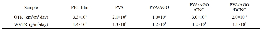 PVA/AGO/DCNC 코팅 필름의 배리어 특성 분석.Table 2에 각 코팅 용액을 PET 기재 필름 위에 코팅한 후 측정한 OTR, WVTR 수치를 정리하였다. PVA는 수산기간의 강한 수소결합이 존재하여 조밀한 구조를 형성할 수 있고, 따라서 기체 차단성이 우수하다. PET 기재 필름 위에 PVA 용액만 코팅하여도 기재 필름에 비해 OTR 수치가 93.6% 감소됨을 확인하였다. 다만 PVA 단독 코팅 시에는 PVA 사슬 내의 고유한 친수성 작용기가 수분에 취약하기 때문에 WVTR 수치 개선이 미미하였다. 따라서 박리된 그래핀을 알킬화하여 소수성을 부여한 AGO를 도입함으로써 배리어 필름의 소수성을 증가시켜 수분 투과도 특성을 보완하고자 하였다. AGO는 알킬화가 진행되었기 때문에 그래핀 옥사이드에 비해 산
