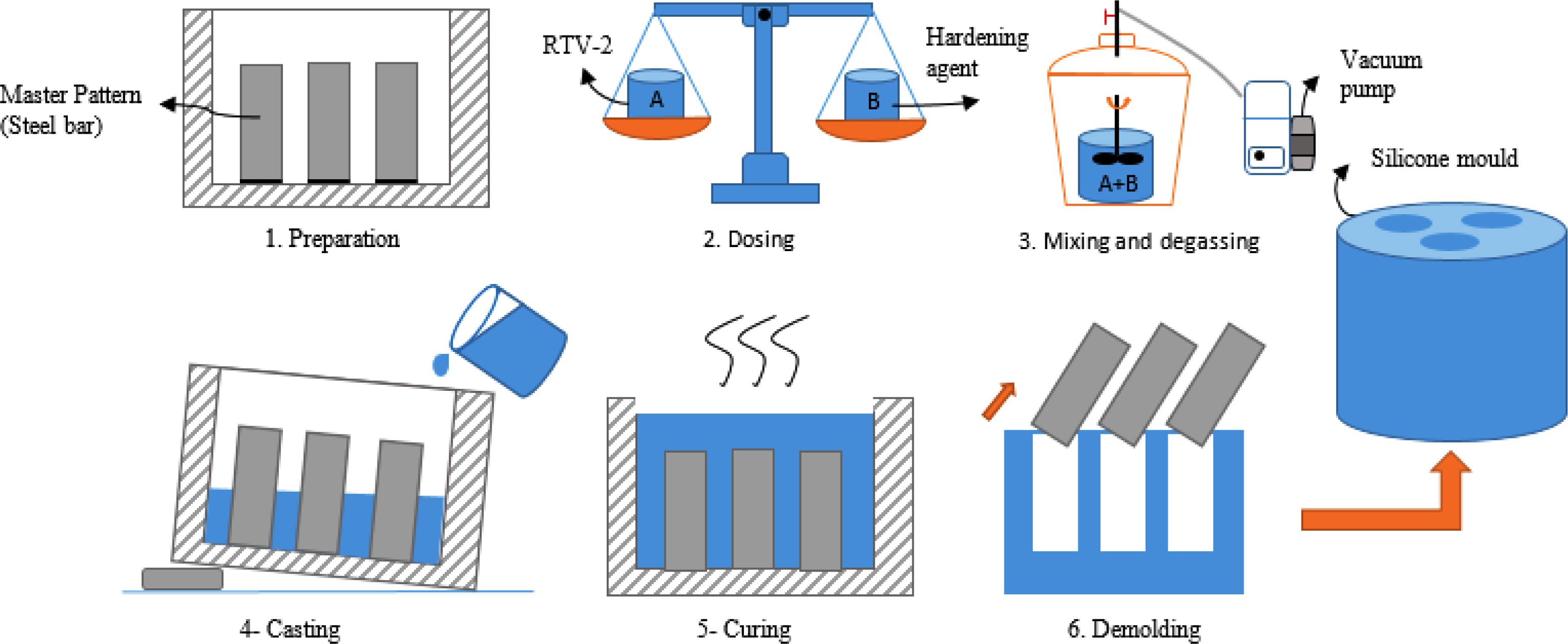 Production of Silicon Mold and Reinforced PU Test Samples. The silicone mold was prepared first to produce the PU wear test specimens. During the silicone mold preparation phase, master steel samples (Ø10×25 mm) manufactured in the size of the wear-test samples were used. These samples adhered to the base surfaces of cylindrical containers, which were then filled with mold silicone. The material used was room-temperature vulcanizing (RTV-2) silicon with a Shore A hardness value of 20. During the silicone preparation process, the mold silicone was mixed with the hardening agent and kept under vacuum for 10 min. The silicone mixture was poured into the prepared cylindrical containers over the cylindrical samples adhered to the base surface, and then kept under vacuum for 20-25 min, thus preventing the formation of air bubbles on the surfaces of the test samples. After degassing, the whole structure was kept in an oven at 40-45 °C for 12 h to achieve better dimensional accuracy.18 The steel samples were removed from the silicone mold that had been cured in the oven, making it ready for casting. The silicon molding process is shown schematically in Figure 1.