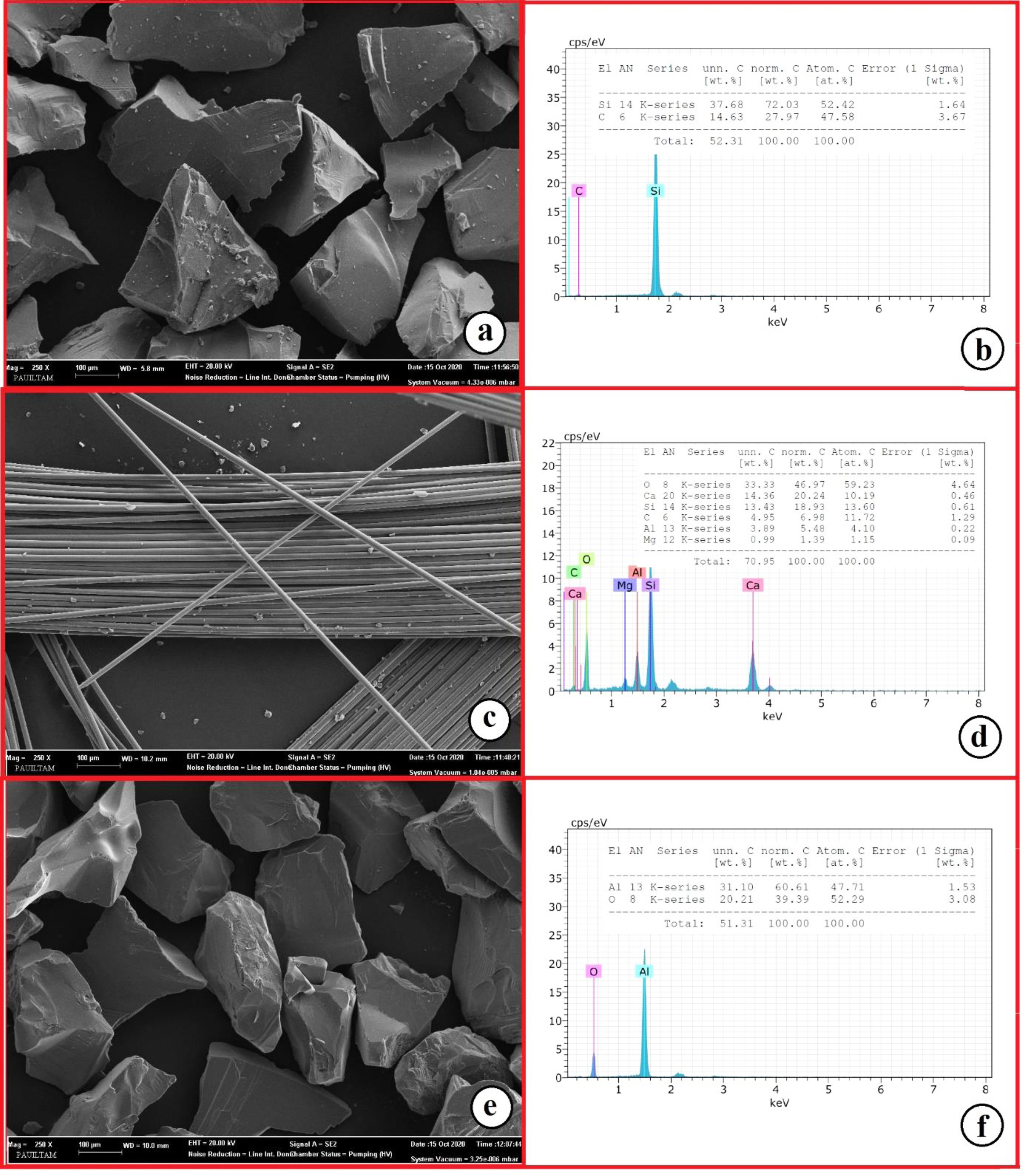 Reinforcement materials used in PU composites: (a-b) SiC; (c-d) GF; (e-f) Al2O3