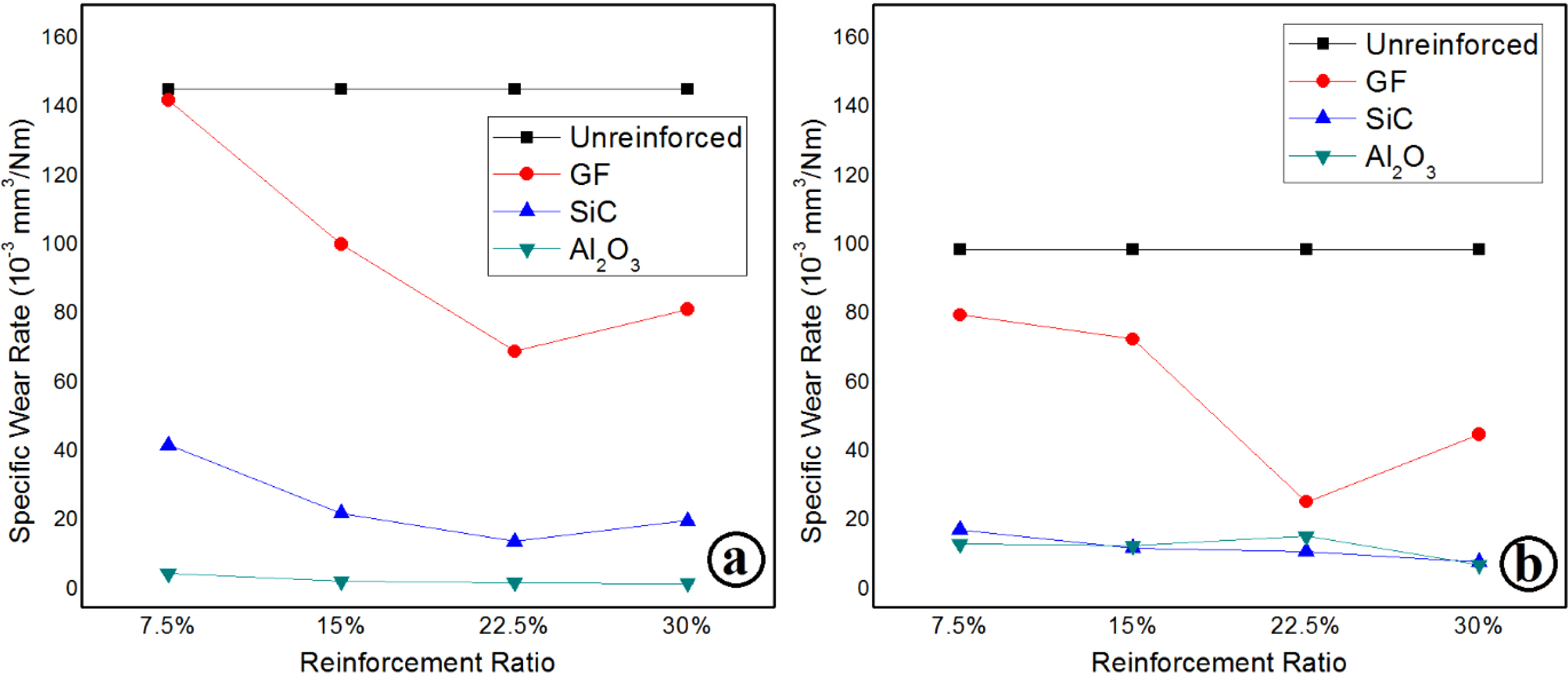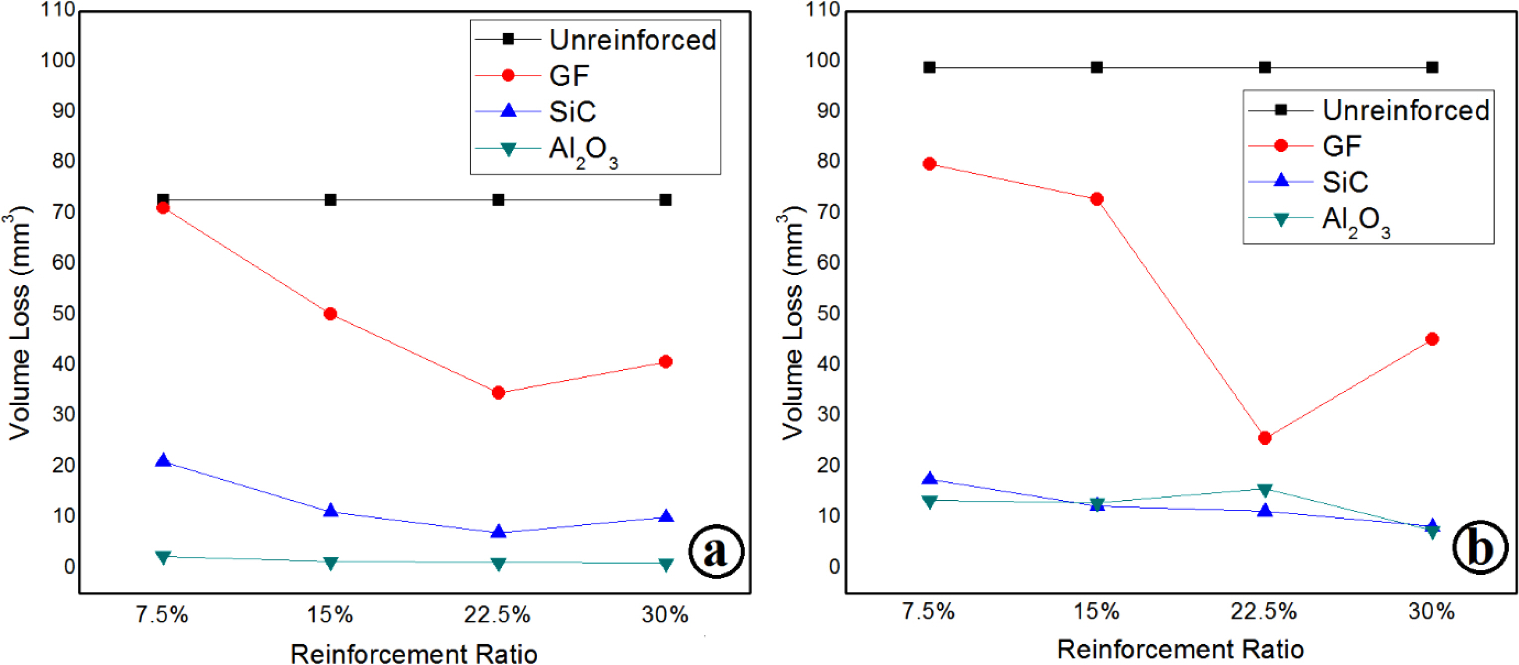 The effect of the reinforcement ratio on volume loss for different loads of 5 and 10 N is shown in Figure 5(a) and (b), respectively. Under the 5 N load, the wear volume decreased with up to 22.5% reinforcement. However, volume loss increased slightly for all reinforcement materials at 30% in the PU composites. Because PU is a soft thermoplastic and GF, SiC, and Al2O3 are hard materials, the main matrix reached saturation when the reinforcement ratio was increased to 30%. The excessive increase of hard materials in the soft thermoplastic matrix increased the wear rate of the thermoplastic composites.20-25 The volume loss of the reinforced PU at 10 N was similar to that at 5 N. The lowest volume loss was obtained with the Al2O3-reinforced PU specimen, with the SiC specimen in second place. The GF also exhibited better performance than the unreinforced PU in the abrasive wear tests. Moreover, the results revealed that particle reinforcement played a more effective role in wear resistance than fiber reinforcement. Due to the chemical and physical properties of the reinforcement materials, the adhesion properties to the polymer matrix during casting and curing would be different.26-28 Although GF exhibits much better wear resistance than unreinforced PU, it is spalling during wear experiments. These chemical reactions affect volume loss and wear rate negatively for GF reinforcement. Particle-reinforcements adhered better to the polymer matrix and increased the wear resistance of PU. Consequently, because the SiC and Al2O3 adhered to the PU matrix better than the GF, this led to increasing friction and therefore, the GF had a lower volume loss than SiC and Al2O3 reinforcements.