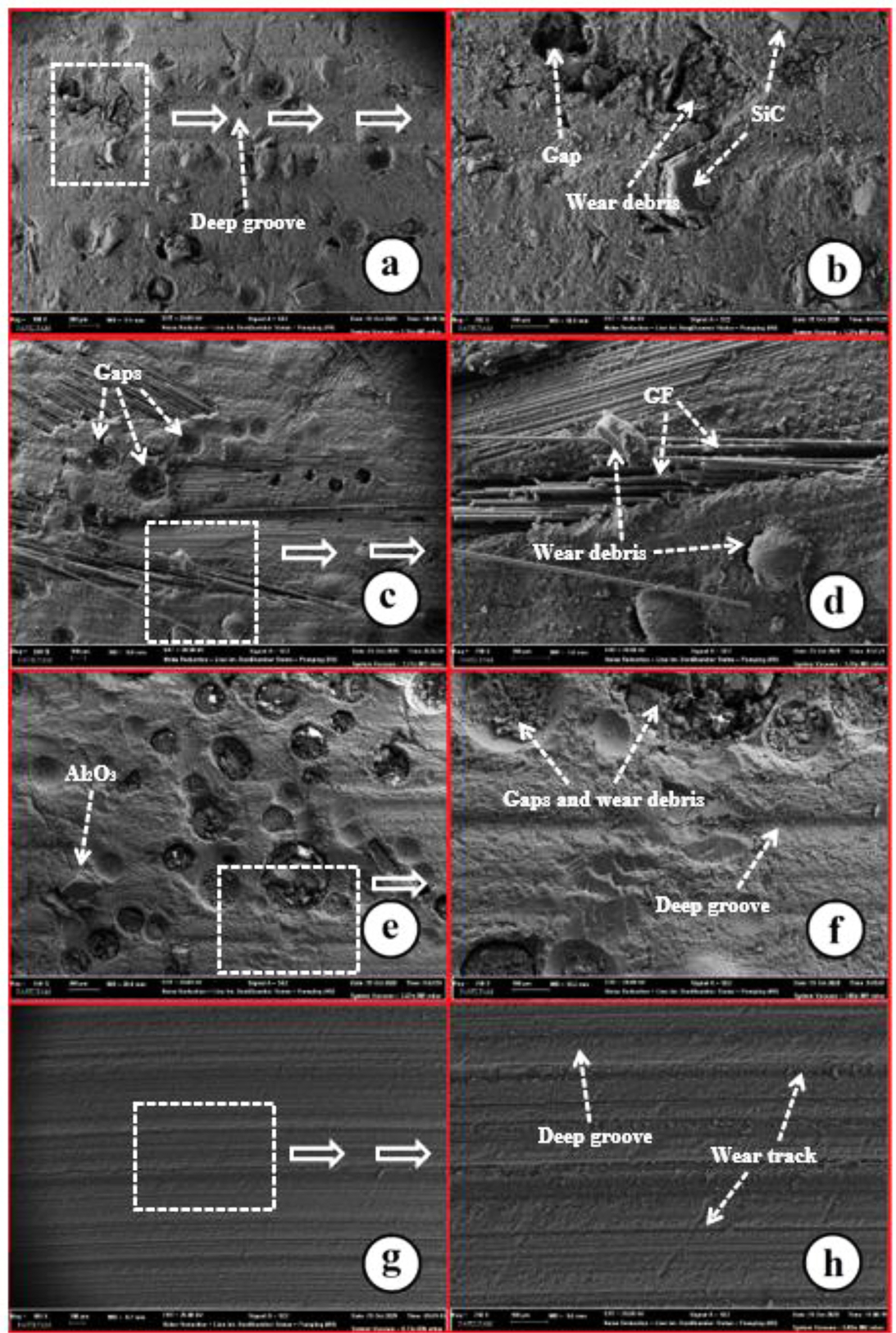 Figure 8 shows SEM images of the worn surfaces of unreinforced PU and PU composites reinforced with SiC, GF, and Al2O3 at 30 wt% content. As seen in Figure 8(g)-(h), the worn surface of unfilled PU is smoother than that of the filled PU composites. However, gaps are seen on the worn surfaces of the reinforced PU composites (Figure 8(a)-(f)). Some of the gaps are air gaps that occurred because of the reinforcement materials during production. Some of them are gaps caused by the abrasive surface during wear tests. Although the production was carried out under vacuum, air gaps could have occurred between the reinforcement materials and the PU matrix.
