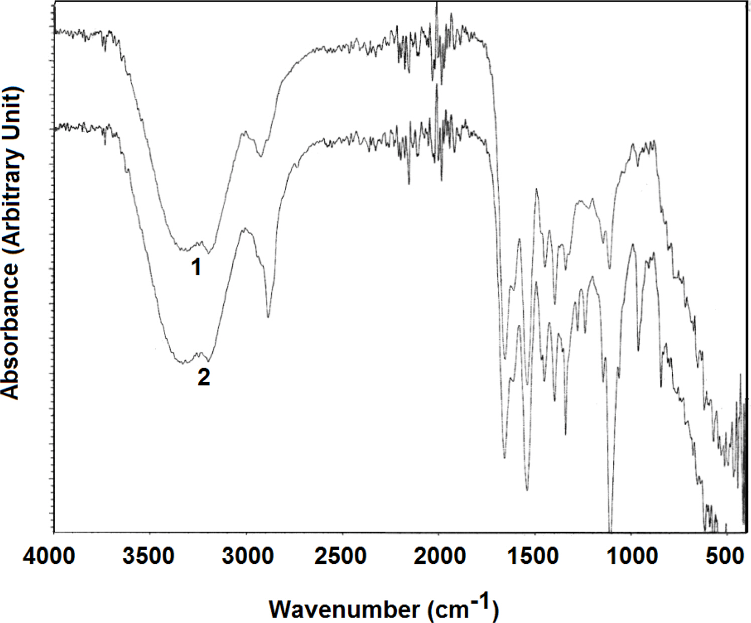 Figure 1 FTIR spectra of the hydrogel with 0% polyethylene glycol (1) and 25% polyethylene glycol (2). |