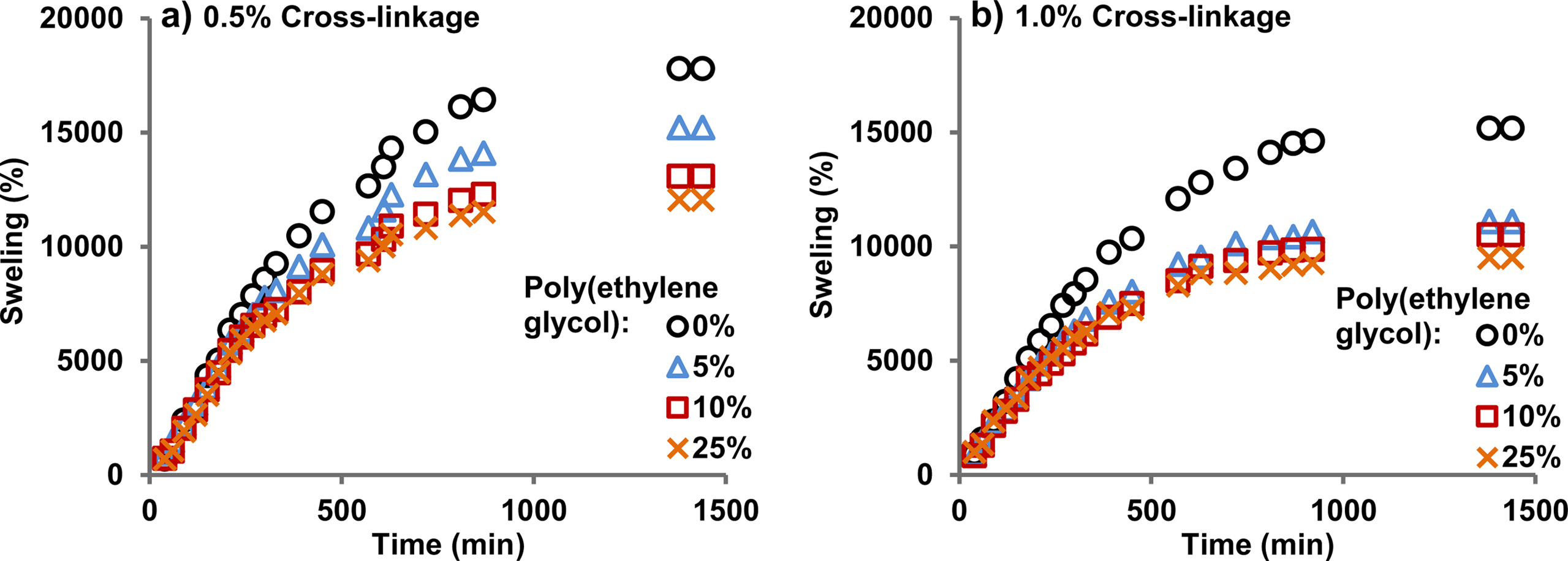 Effect of Poly(ethylene glycol) Content on Swelling in Water. Figure 2 shows that with an increase in the amount of poly(ethylene glycol) from 0% to 25% in the polymer network, the equilibrium swelling decreased for the same degree of cross-linkage. Although the ether groups in poly(ethylene glycol) are hydrophilic, they are less hydrophilic than the ionic groups such as -COO-K+. The reduced ratio of the ionic groups is one factor that explains the observed decrease in swelling upon poly(ethylene glycol) addition. This phenomenon may be explained in terms of network density because as the amount of poly(ethylene glycol) increases more chains entwined the polymeric chains of poly(acrylamide-co-potassium methacrylate. Eventually, the density of network structure increases and resulted less swelling and this observation is consistent with our previously reported results in which poly(vinyl alcohol) was incorporated in acrylamide/potassium acrylate hydrogel system.13 A second factor explaining it is that oxygen atoms in poly(ethylene glycol) chains form hydrogen bonds with protons of amide groups that has almost the same effect as an increase in cross-linkage.