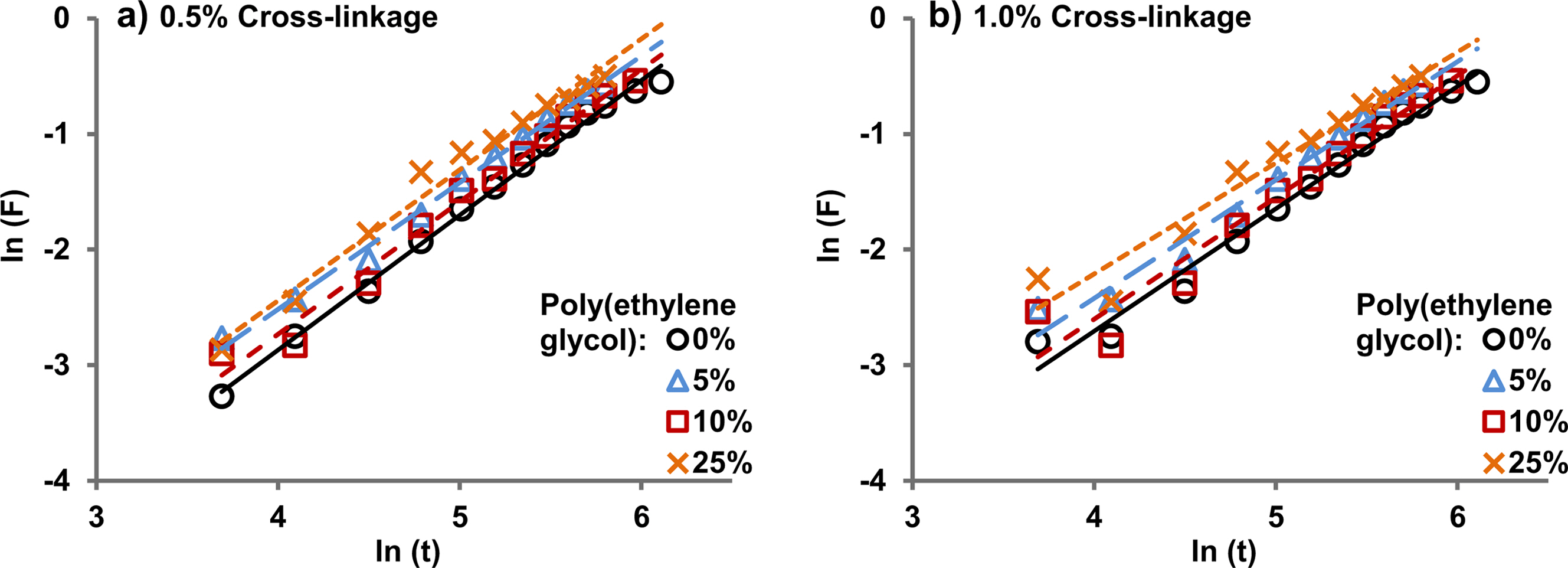 It can be observed from Table 1 that the diffusion constant and diffusion coefficient increase with an increase in poly(ethylene glycol) content in the hydrogel for the same cross-linkage. In other words, the diffusion of water takes place faster in the presence of more poly(ethylene glycol) in the hydrogel. Only one exception to this general trend was observed, i.e., for the case of 10% poly(ethylene glycol) at 0.5% cross-linking in which the kinetic of water diffusion was found to be slower compared to 5% poly(ethylene glycol) for the same cross-linkage. Currently, the authors do not have any plausible explanation for the exception.